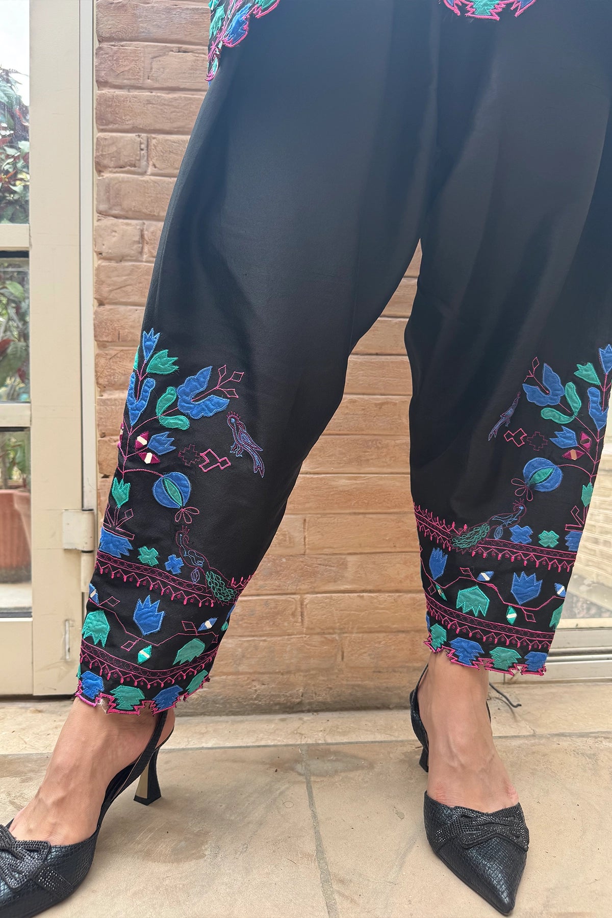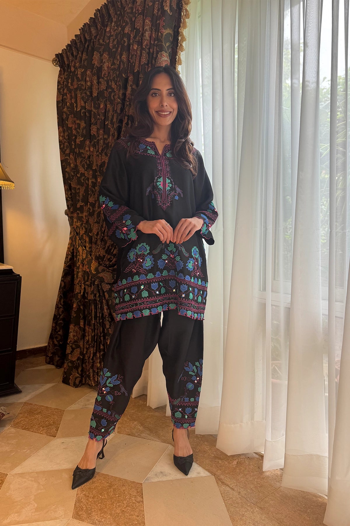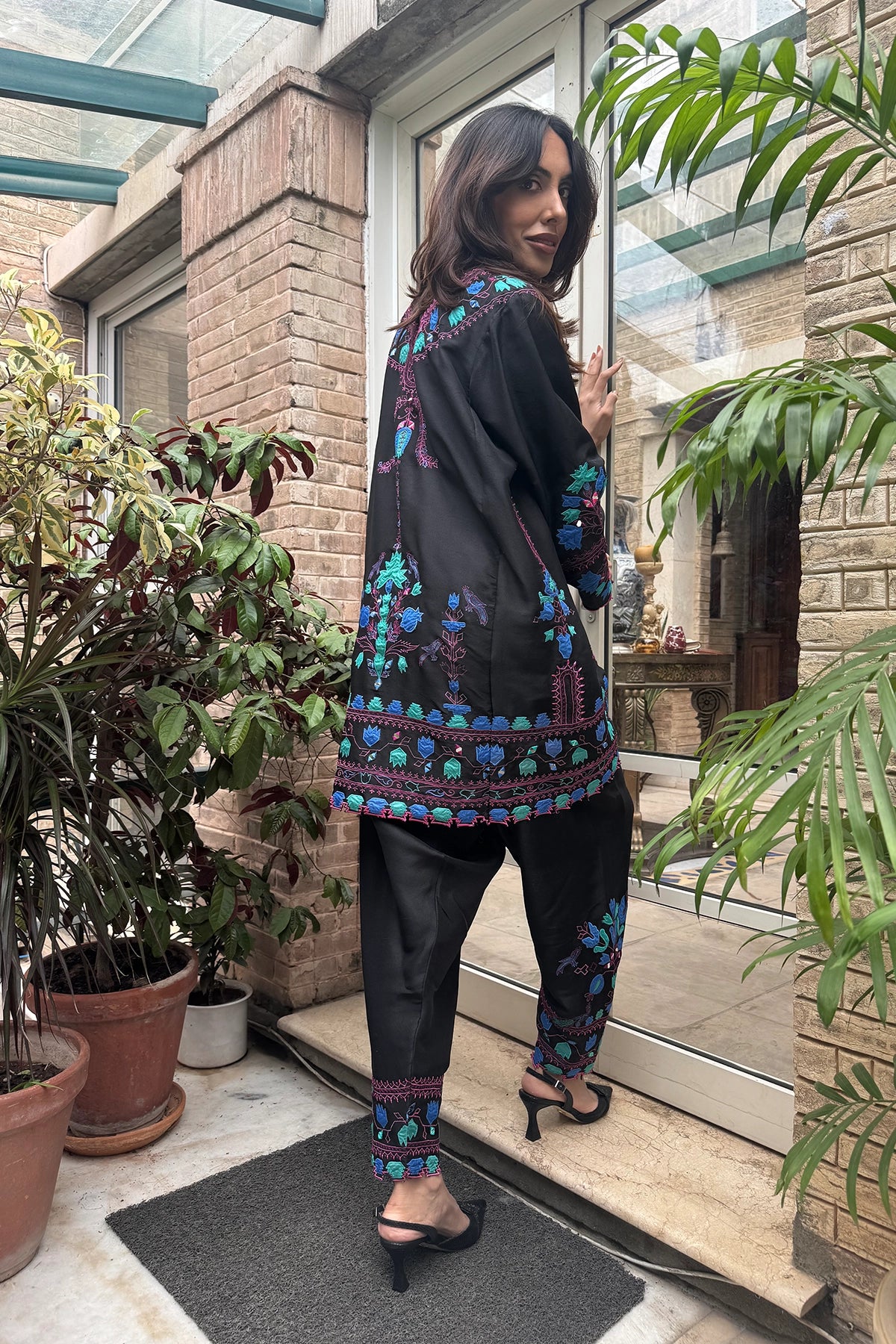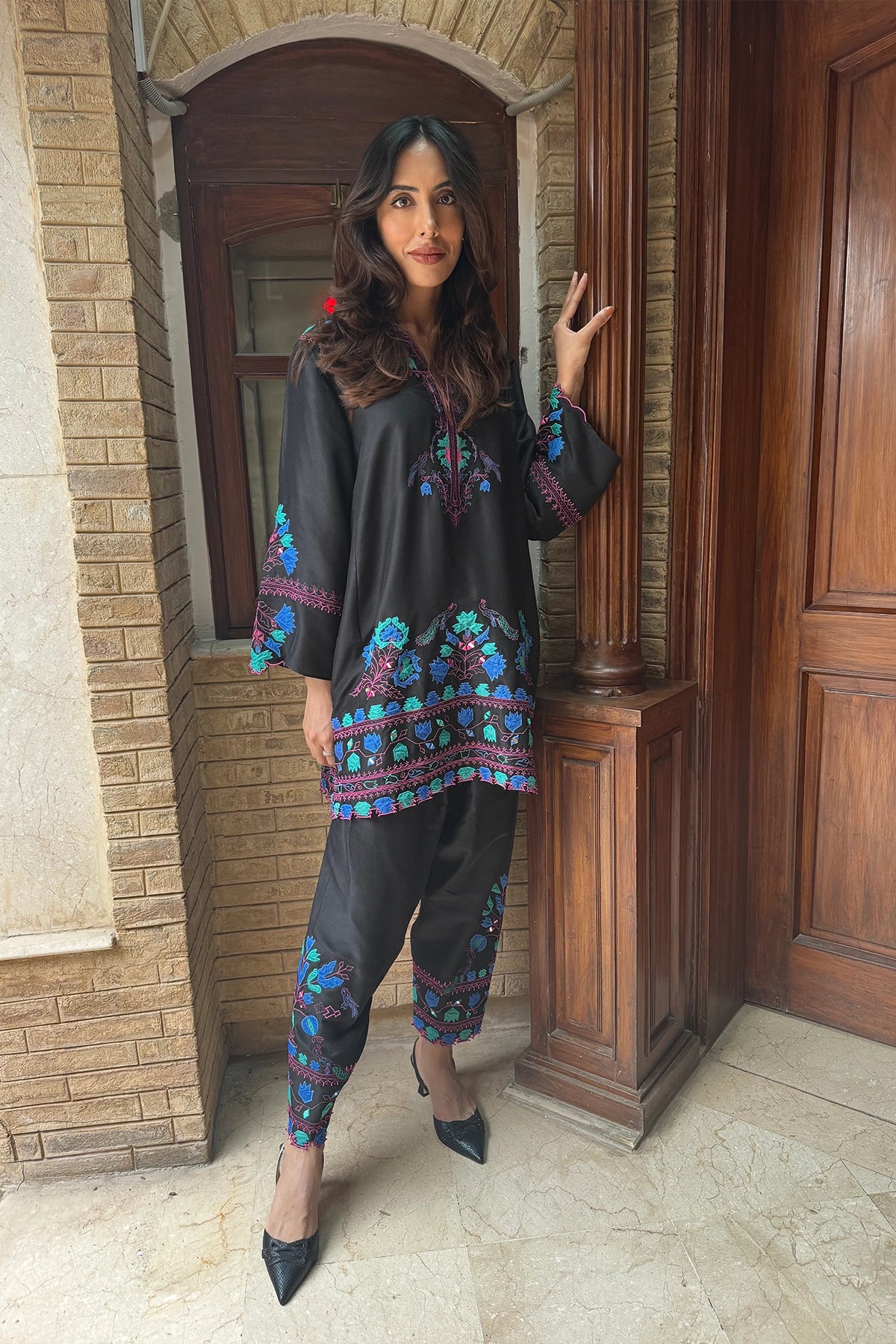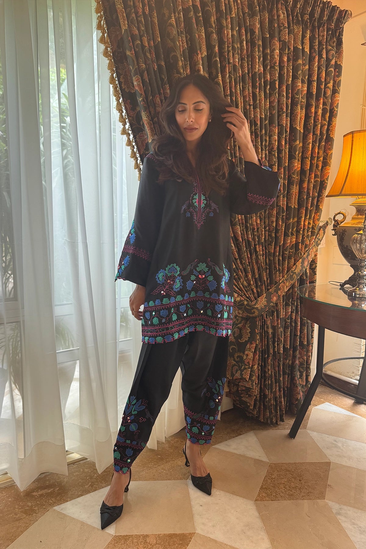 Black Forest is a black two-piece set featuring a short tunic and cropped pants. Vibrant floral and geometric embroidery in blue and magenta adds striking contrast to the design. Available in Pure Rawsilk for a polished, structured finish, Sheesha Silk for an elegant drape, and Kora Cotton for light comfort, this ensemble blends bold detail with timeless sophistication.