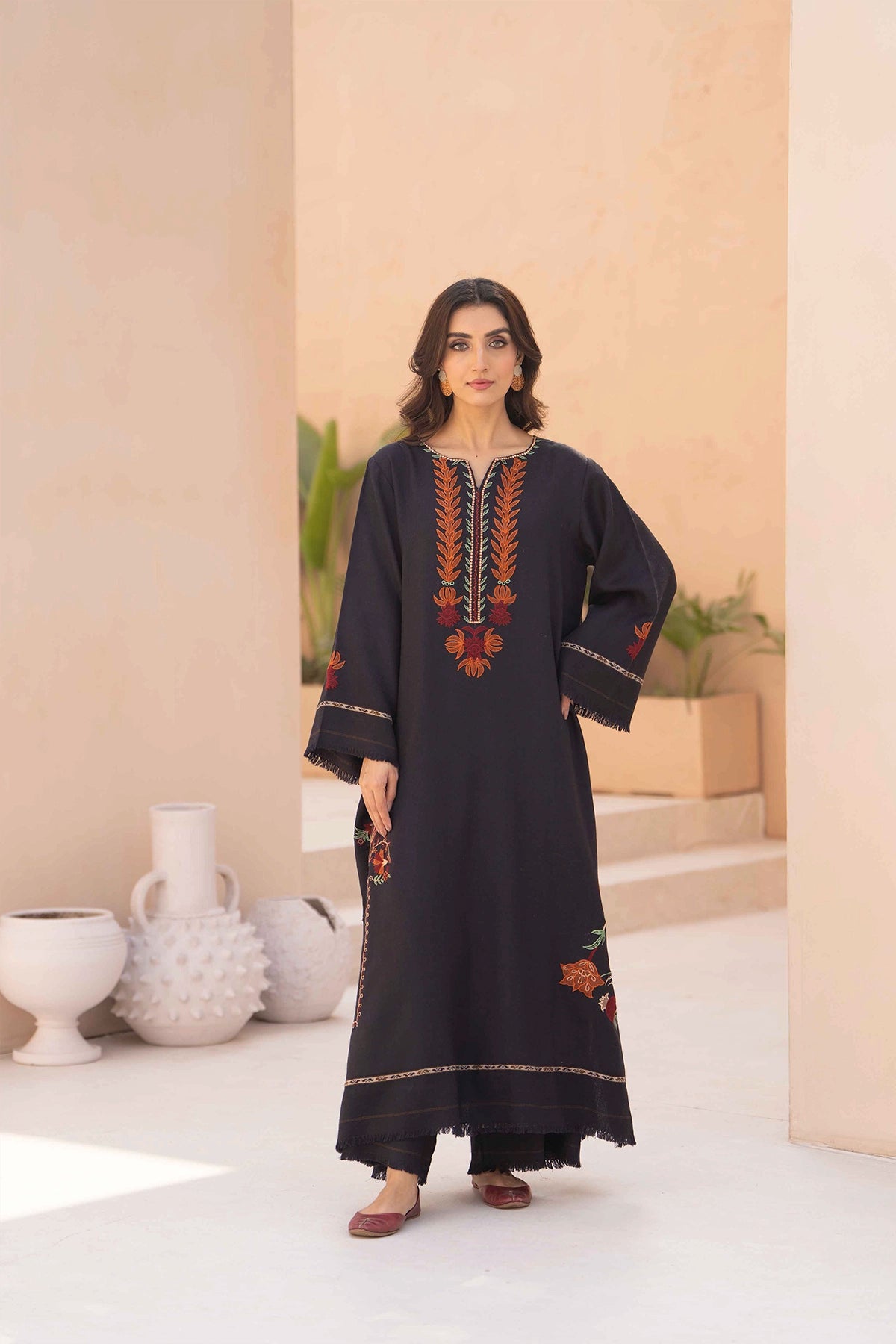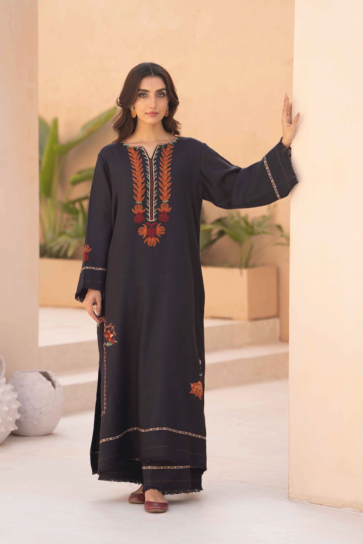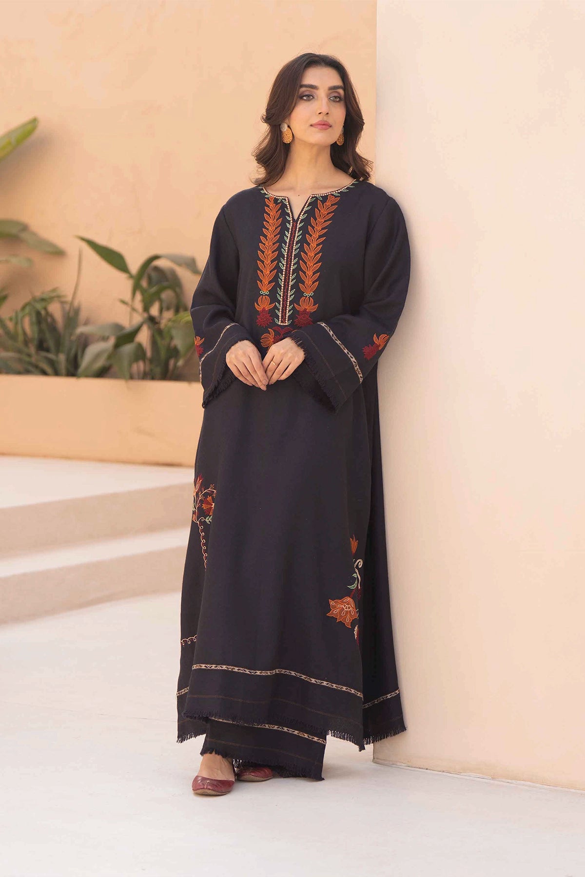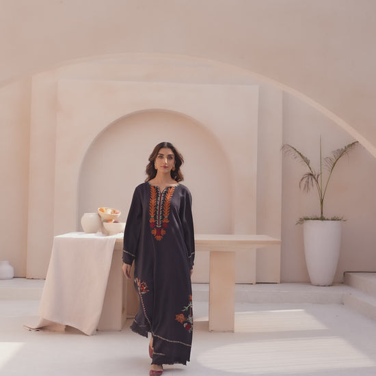 A long charcoal-colored dress in pashmina fabric featuring embroidery around the neckline and scattered across the skirt. The design includes floral and leaf motifs in shades of burnt orange, red, and olive green. Paired with matching trousers for a coordinated look.