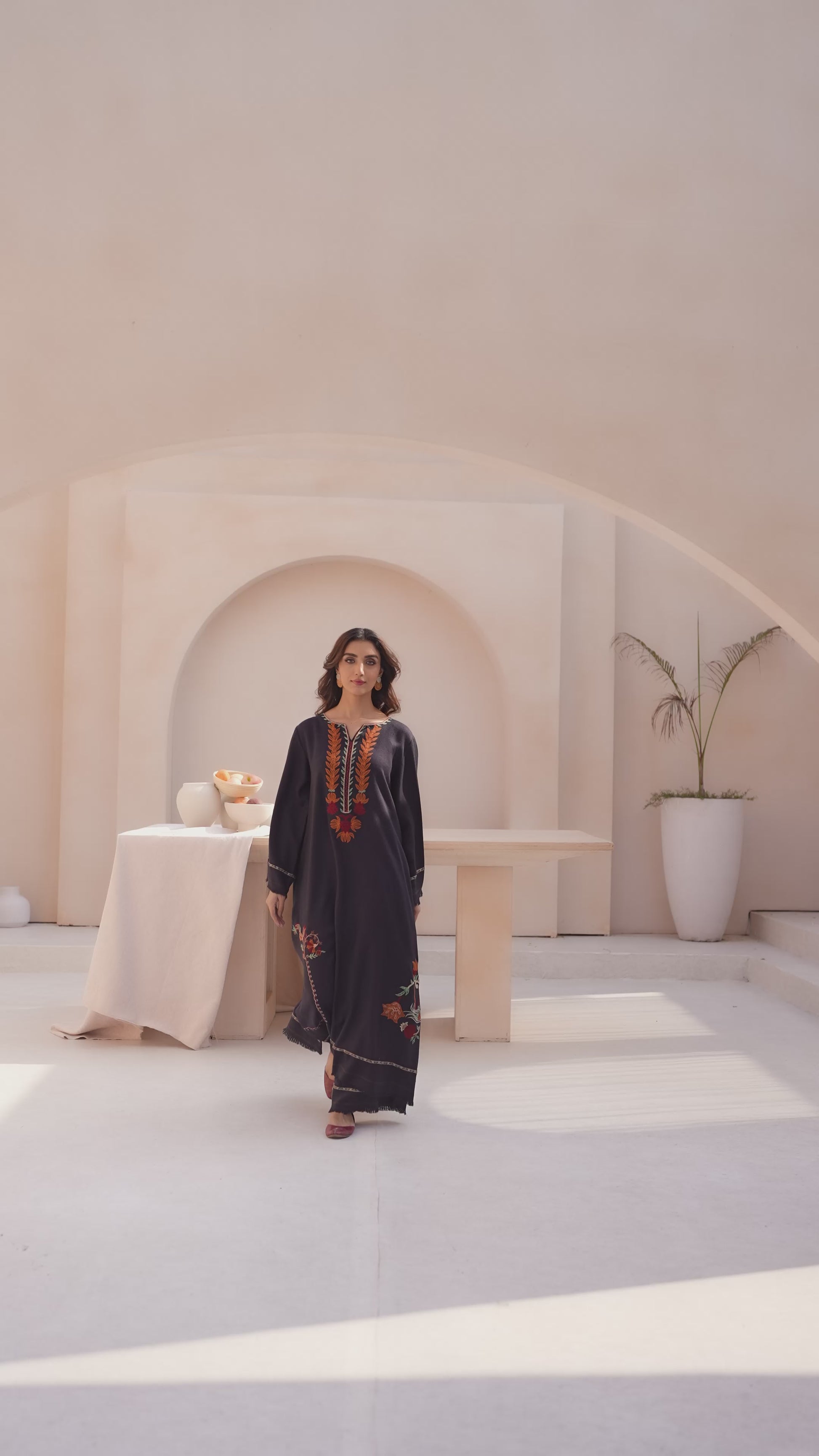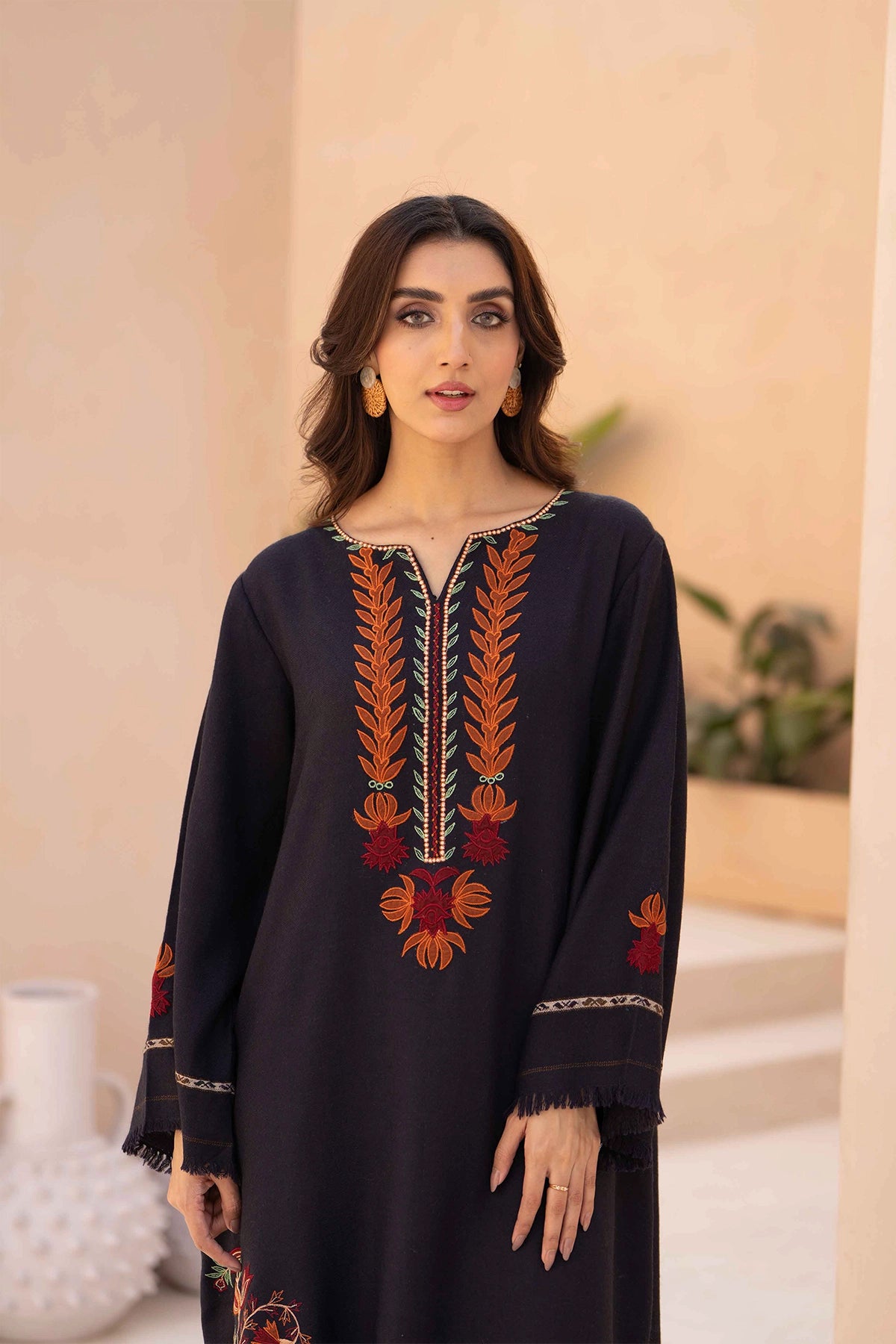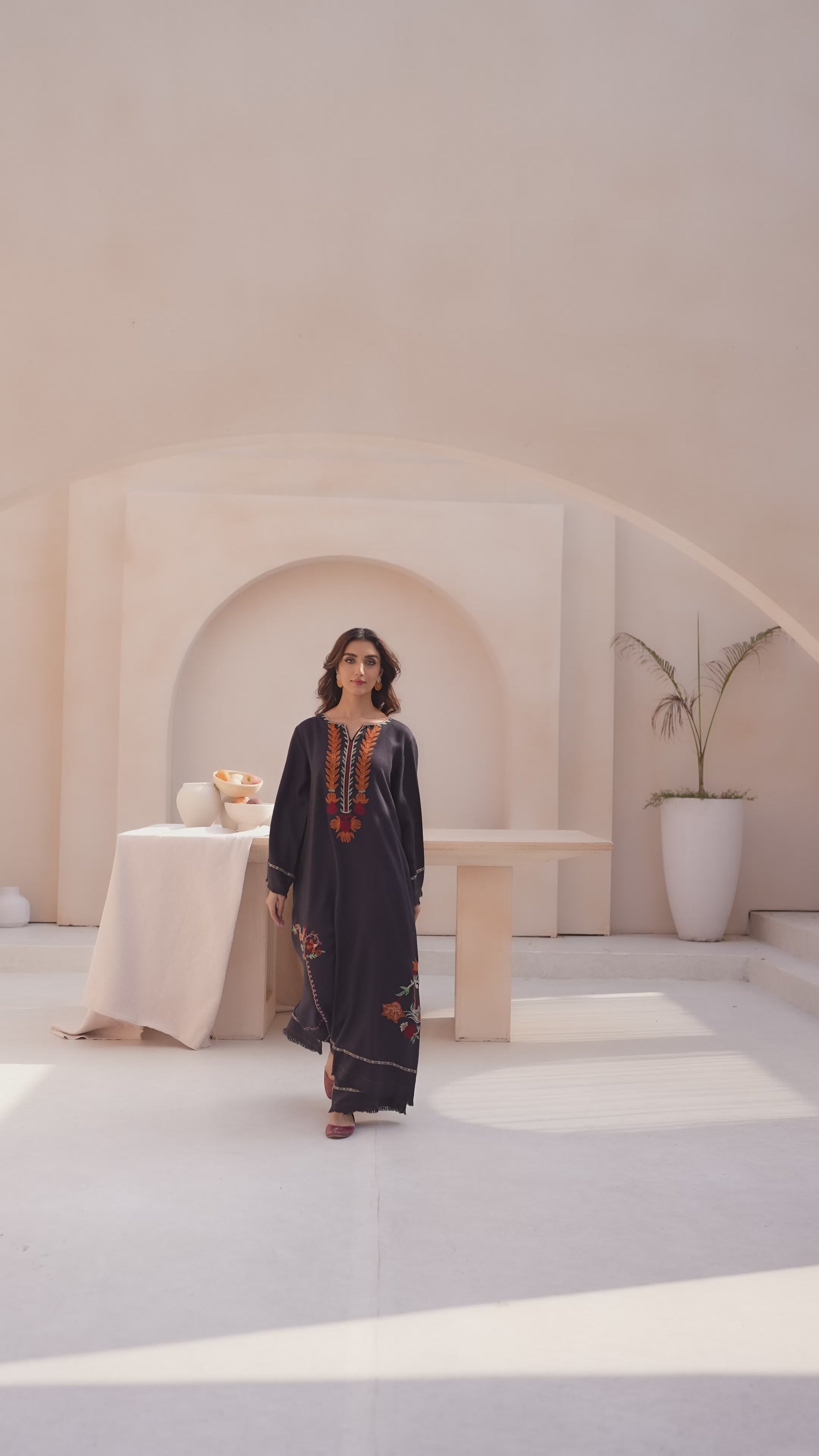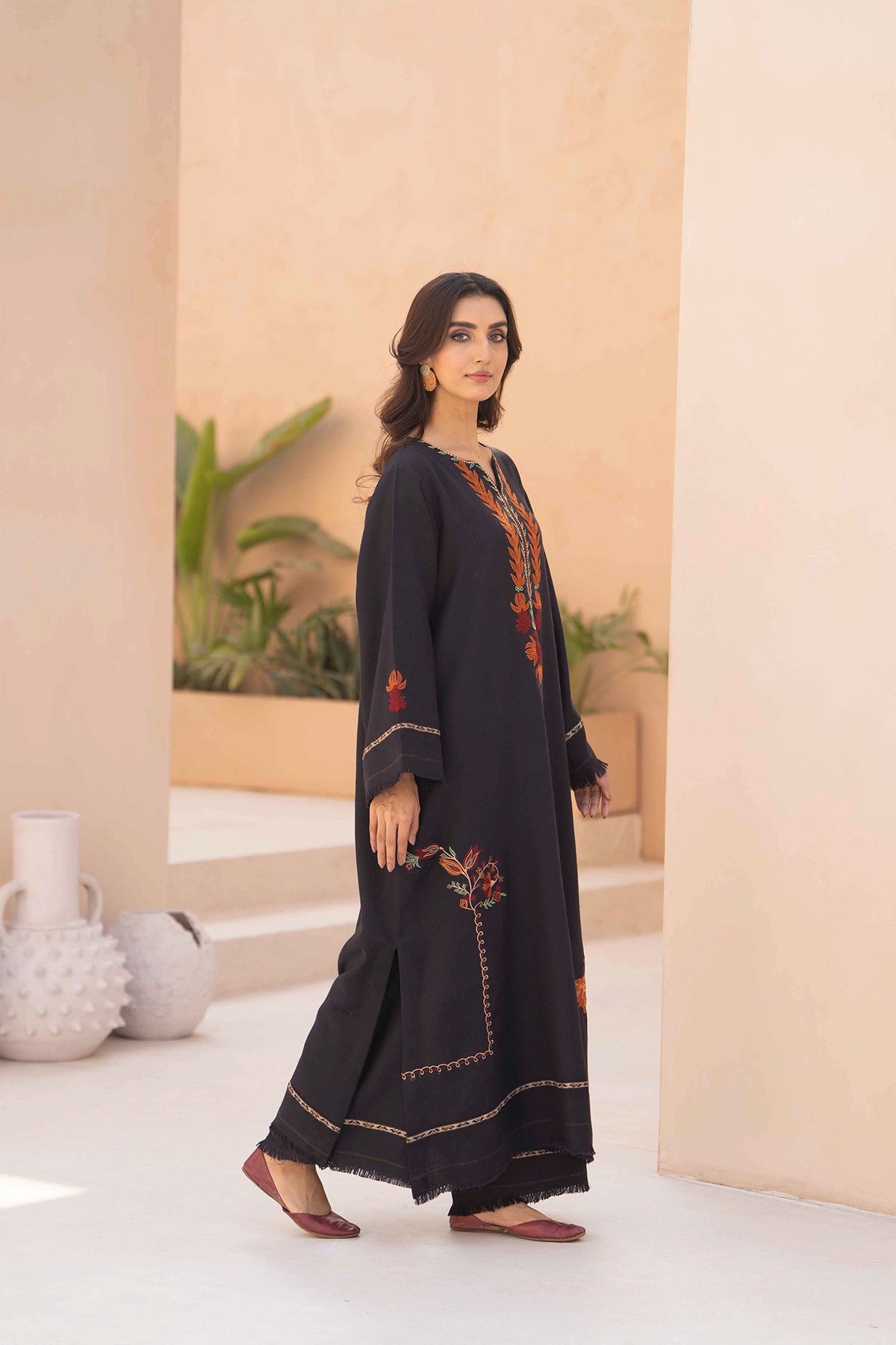 A long charcoal-colored dress in pashmina fabric featuring embroidery around the neckline and scattered across the skirt. The design includes floral and leaf motifs in shades of burnt orange, red, and olive green. Paired with matching trousers for a coordinated look.