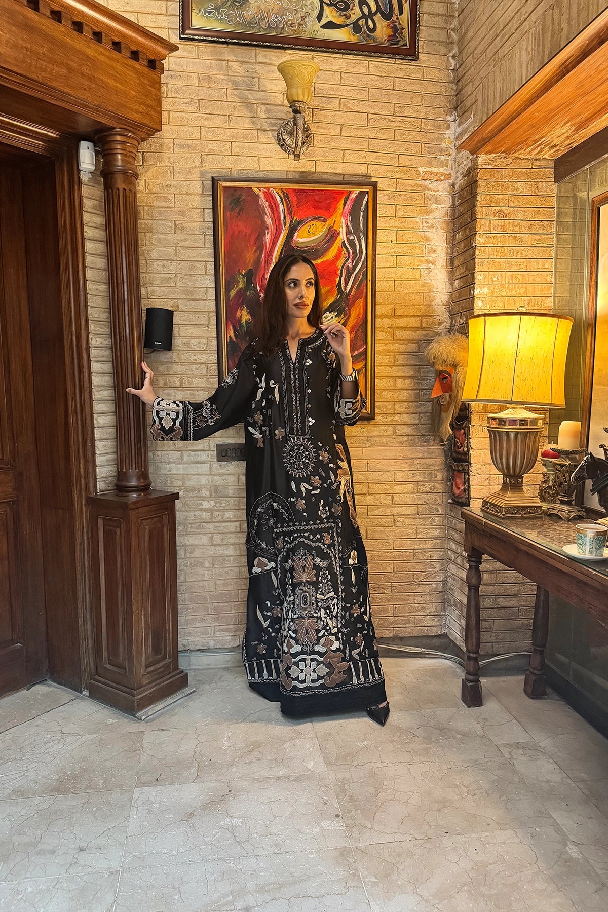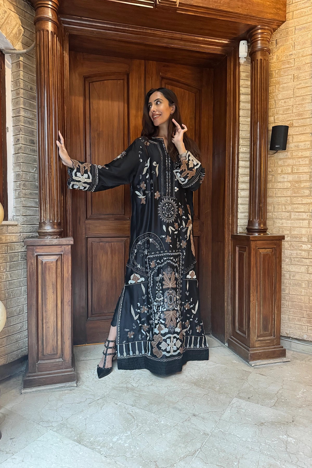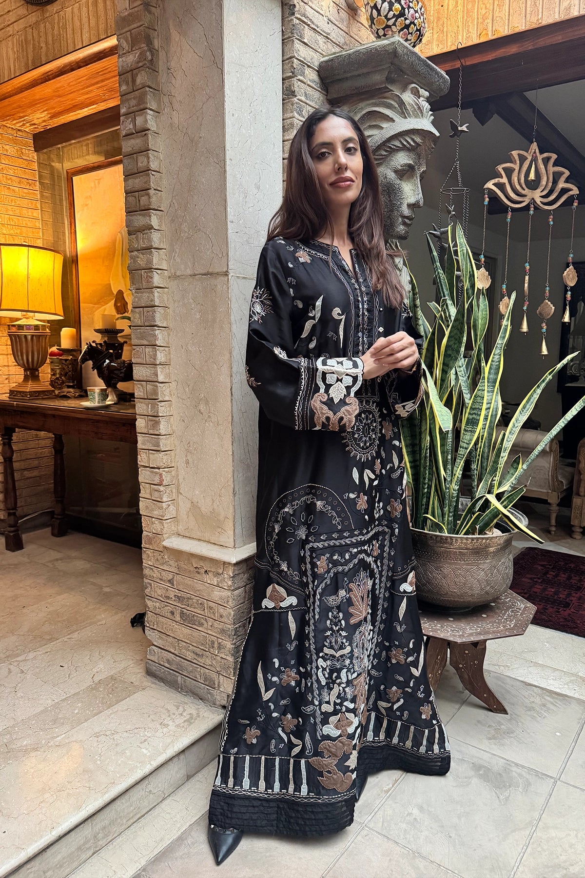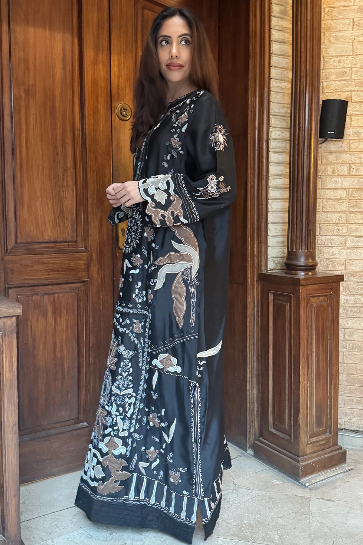 A striking black kaftan embellished with soft brown and nude appliqués, offering a refined yet contemporary look. Sold as a one-piece, this elegant outfit is perfect for understated festive styling.