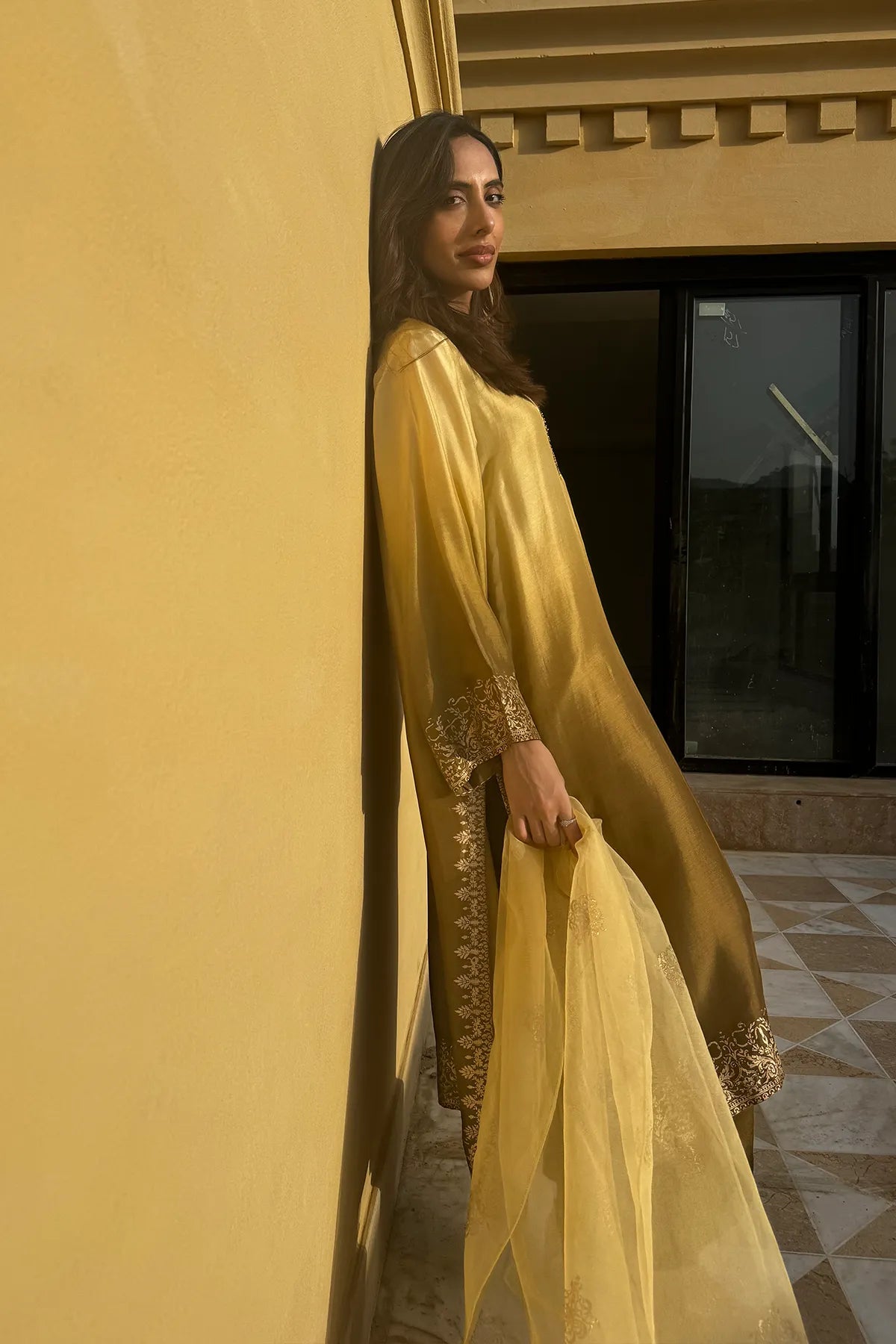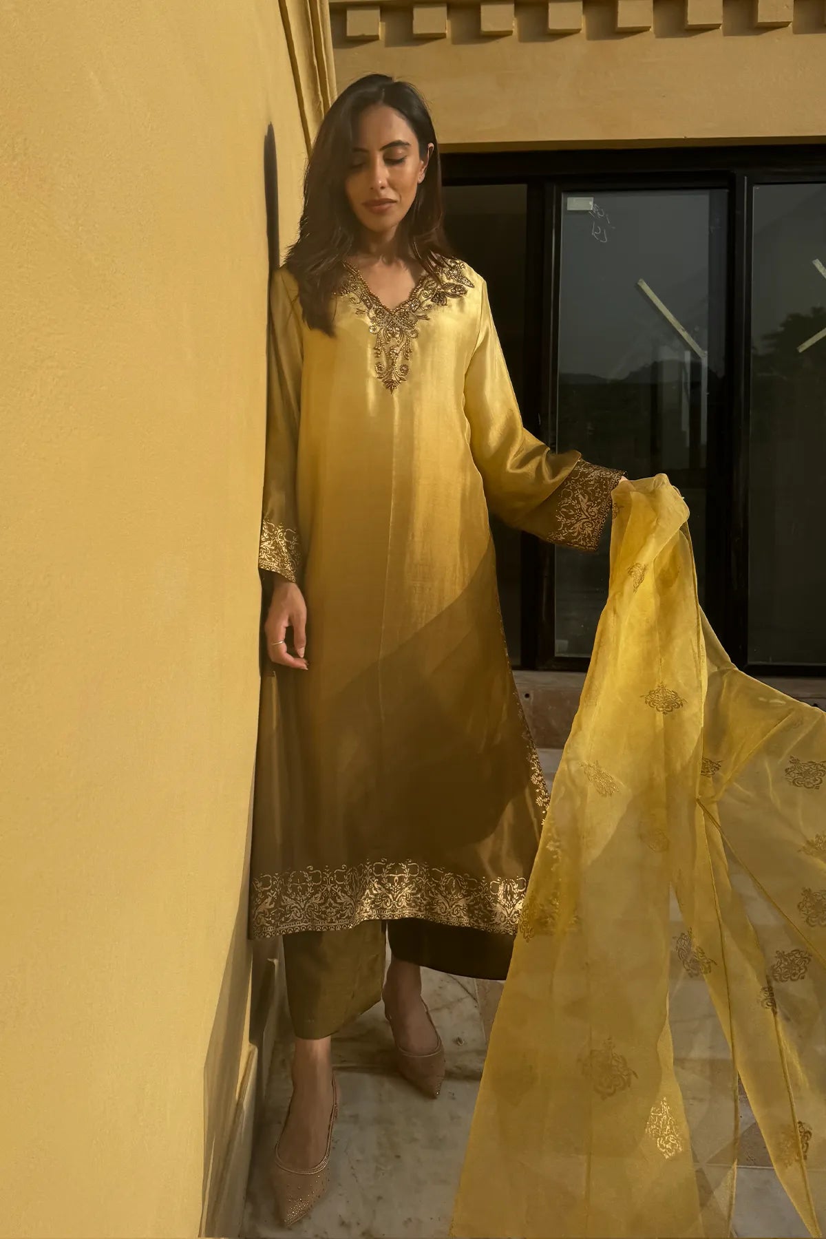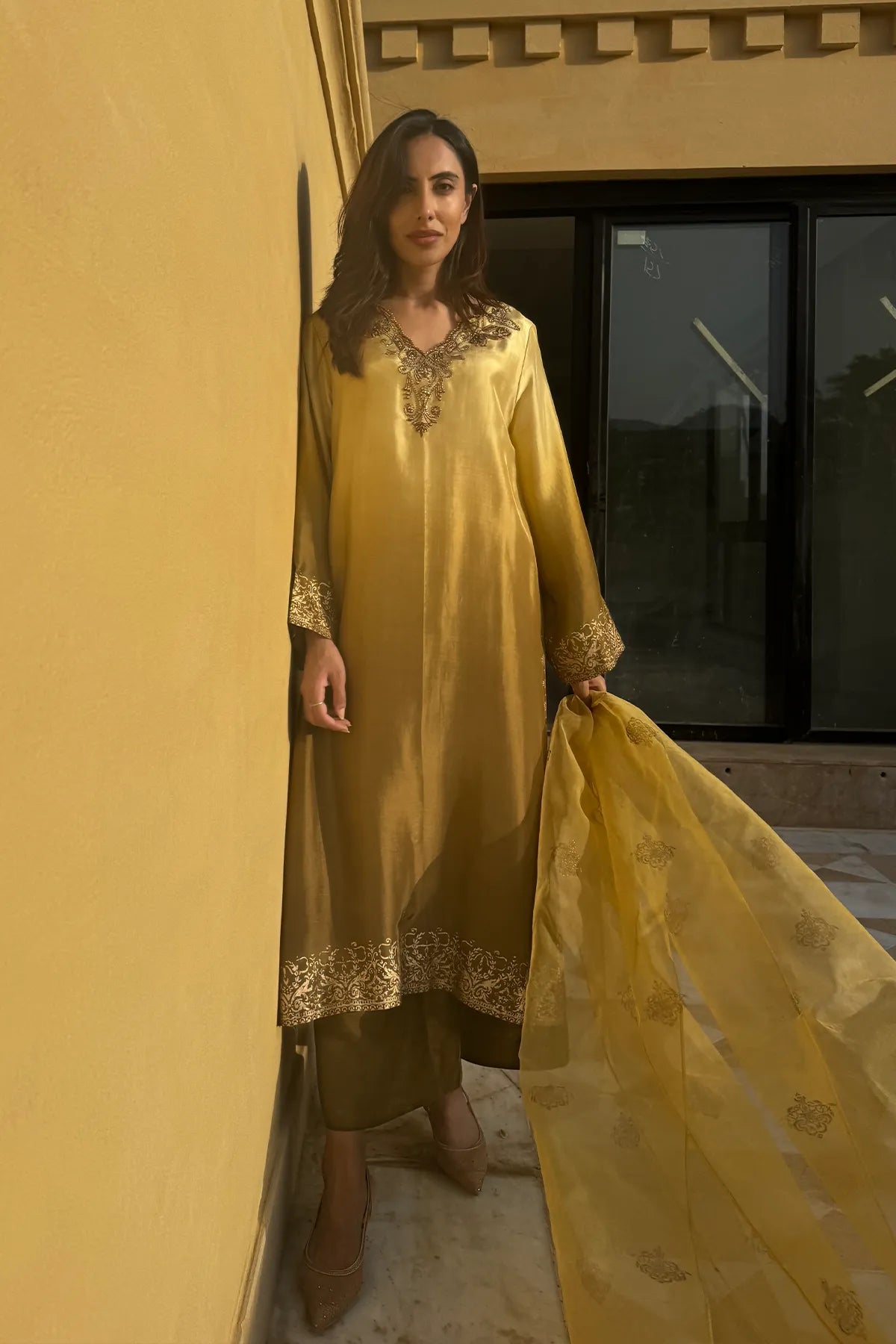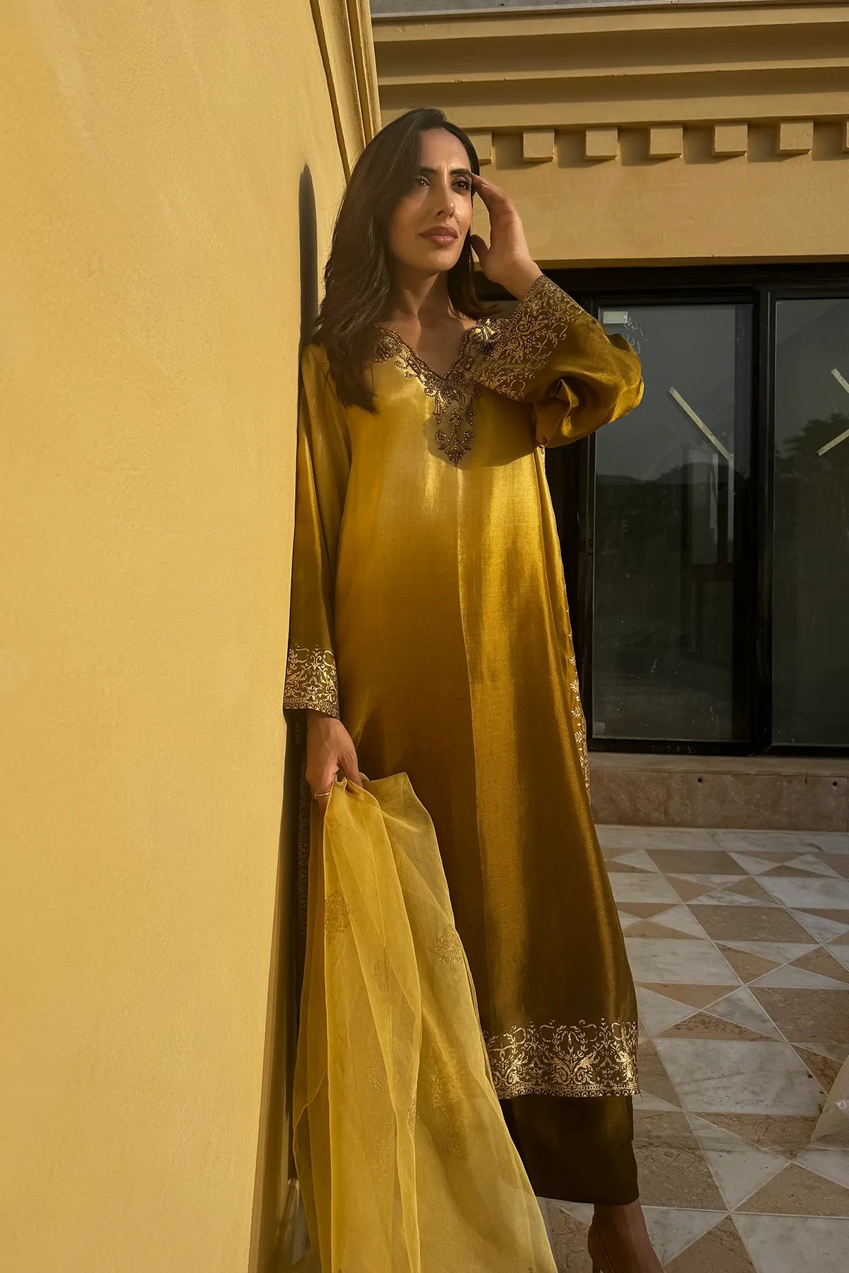 Golden Dusk is a sophisticated three-piece suit in Pure Rawsilk or Sheesha Silk. The long tunic, in a shimmering golden-olive shade, is adorned with intricate gold embroidery along the V-neckline, cuffs, and hem. Paired with matching straight trousers and a sheer organza dupatta.