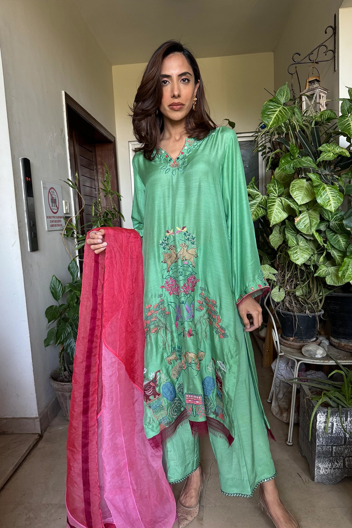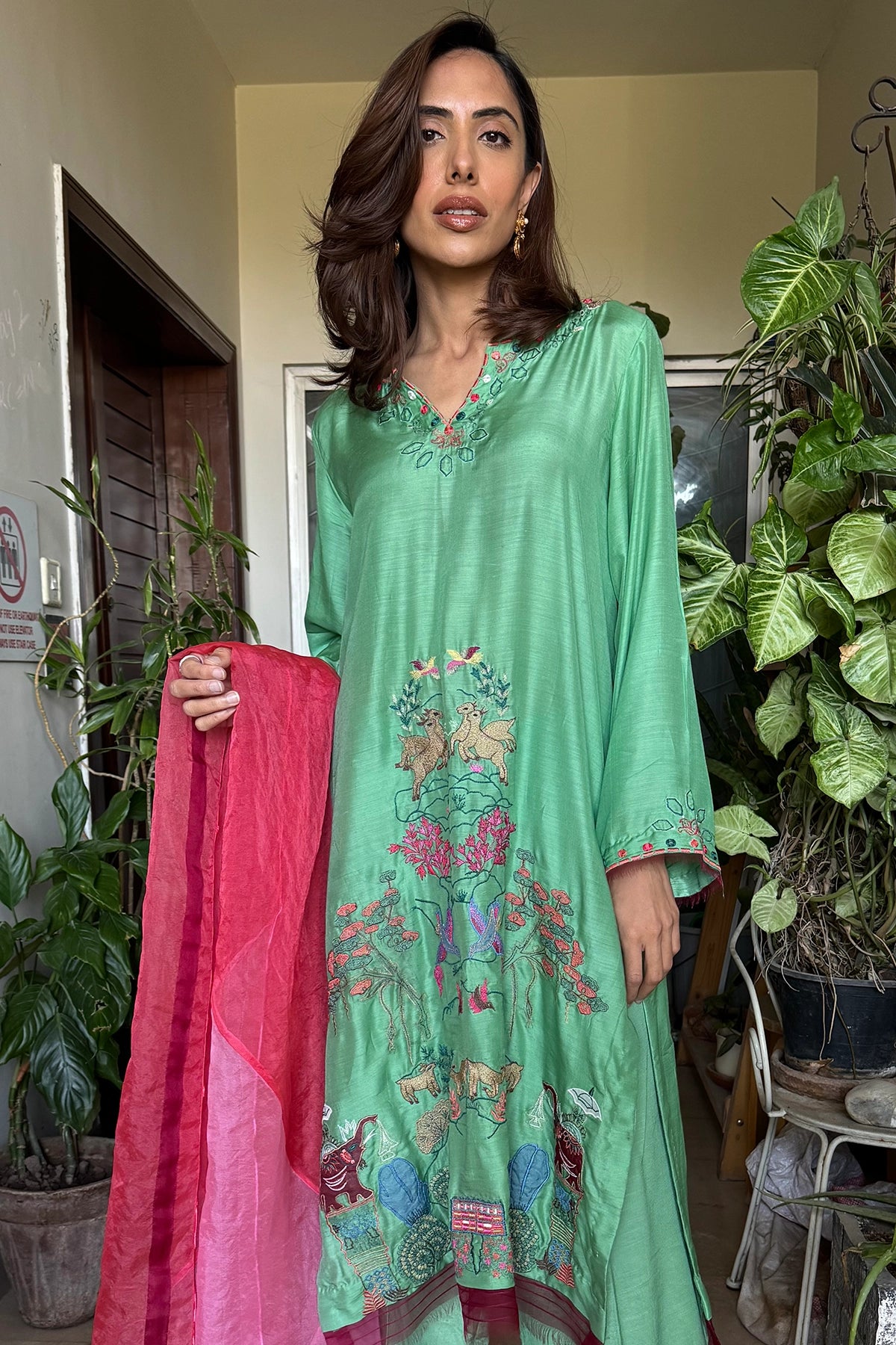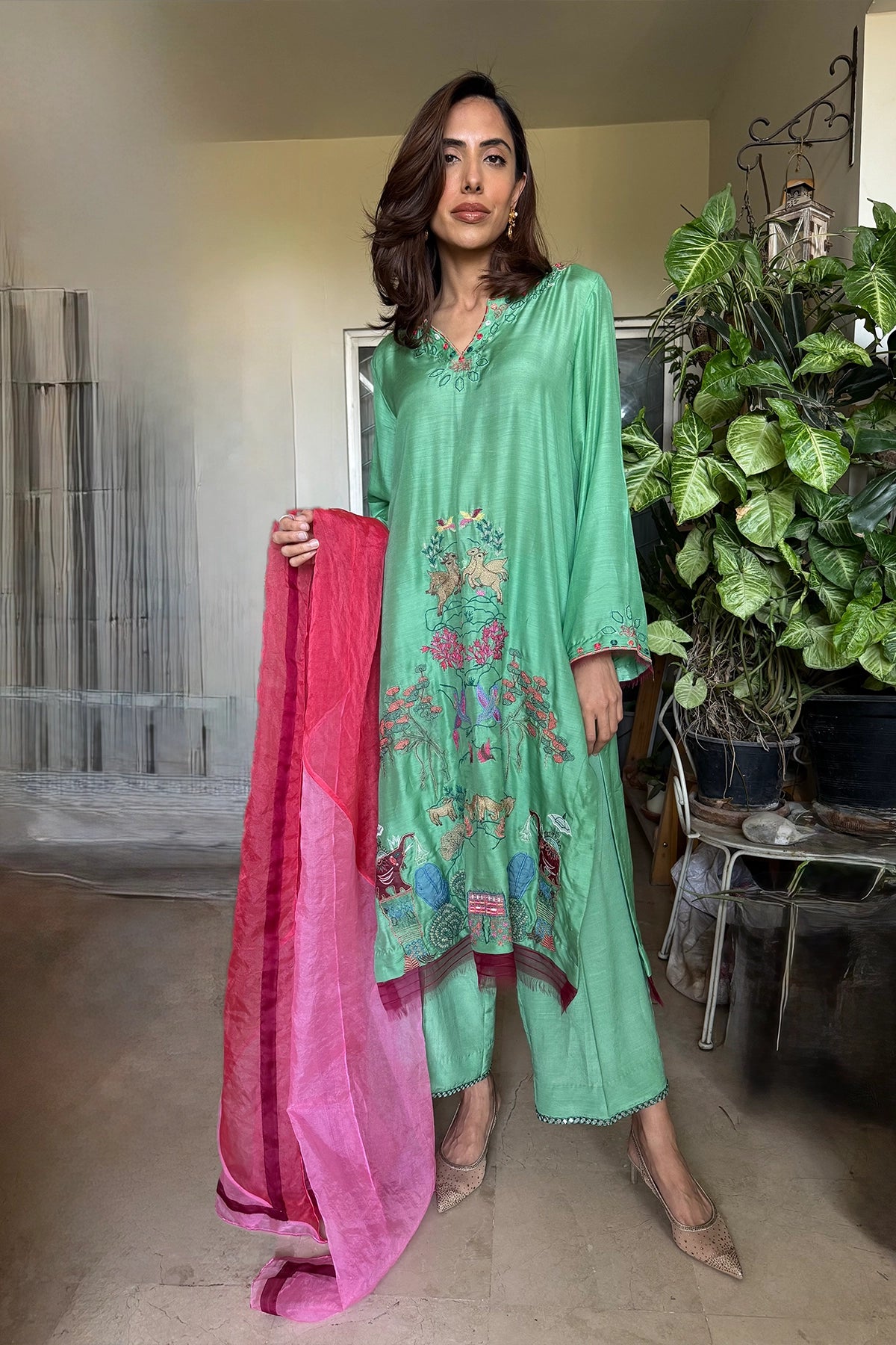 A vibrant green shirt adorned with intricate Shikargah embroidery, paired with a plain trouser for a balanced silhouette. The look is completed with a color-blocked organza dupatta in shades of pink, adding a playful contrast to this elegant ensemble — perfect for festive gatherings.