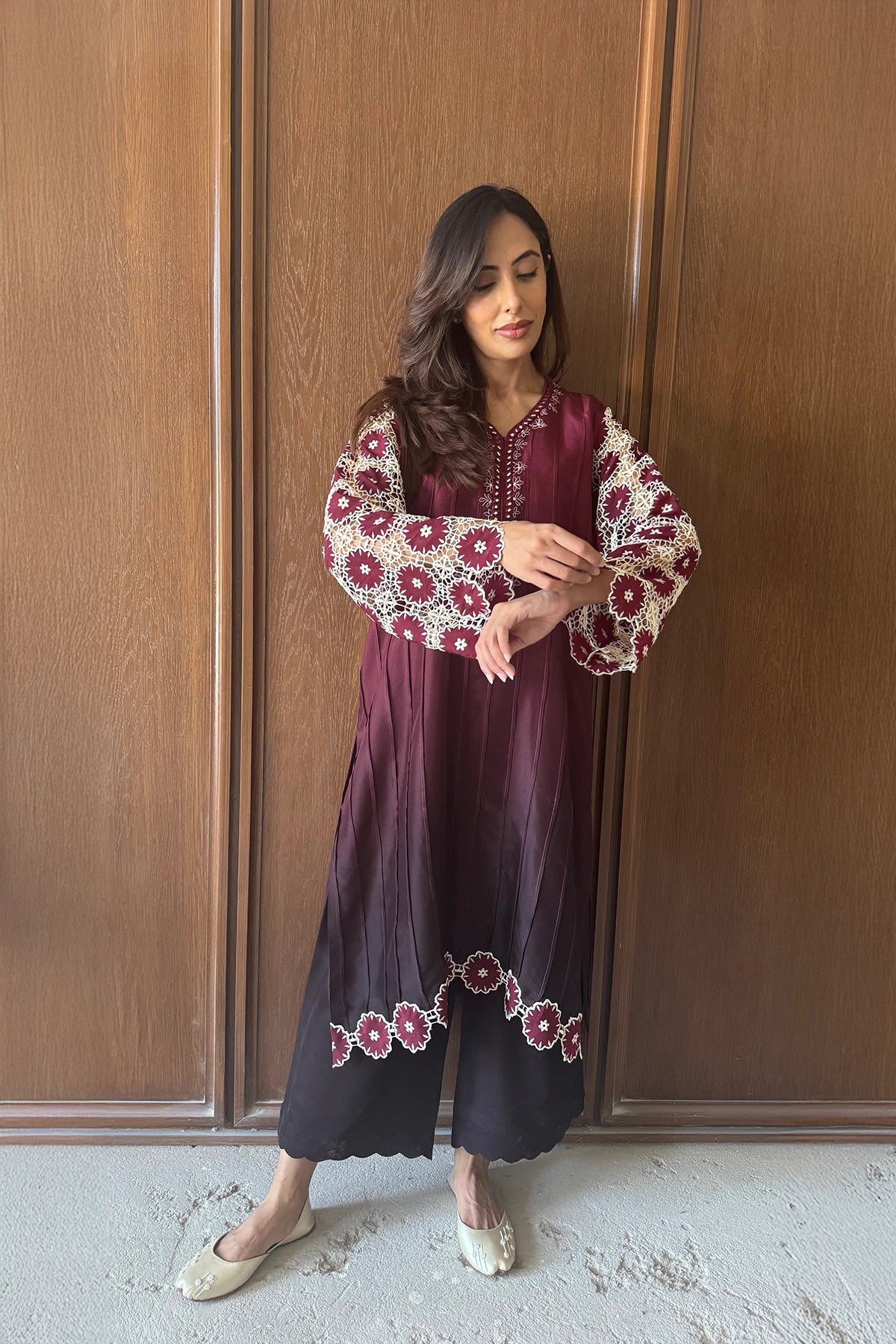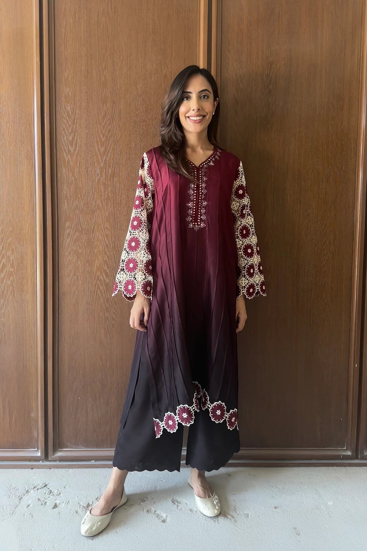 Light Brown Ombré is a two-piece ensemble in Sheesha Silk, featuring a deep maroon shirt with delicate gold embroidery at the neckline. The standout detail lies in the full sleeves with bold cream and red floral cutwork, mirrored on the scalloped hem of the accompanying black wide-leg trousers.