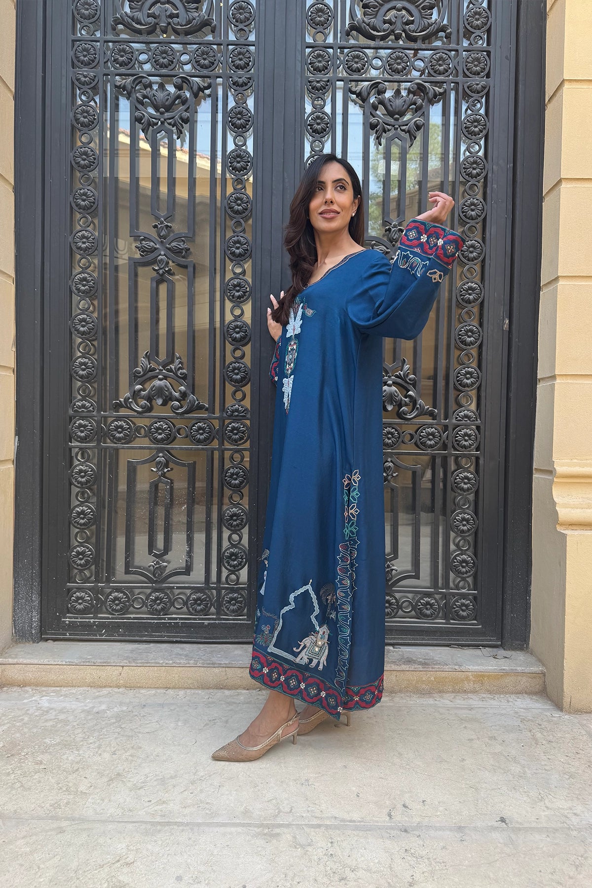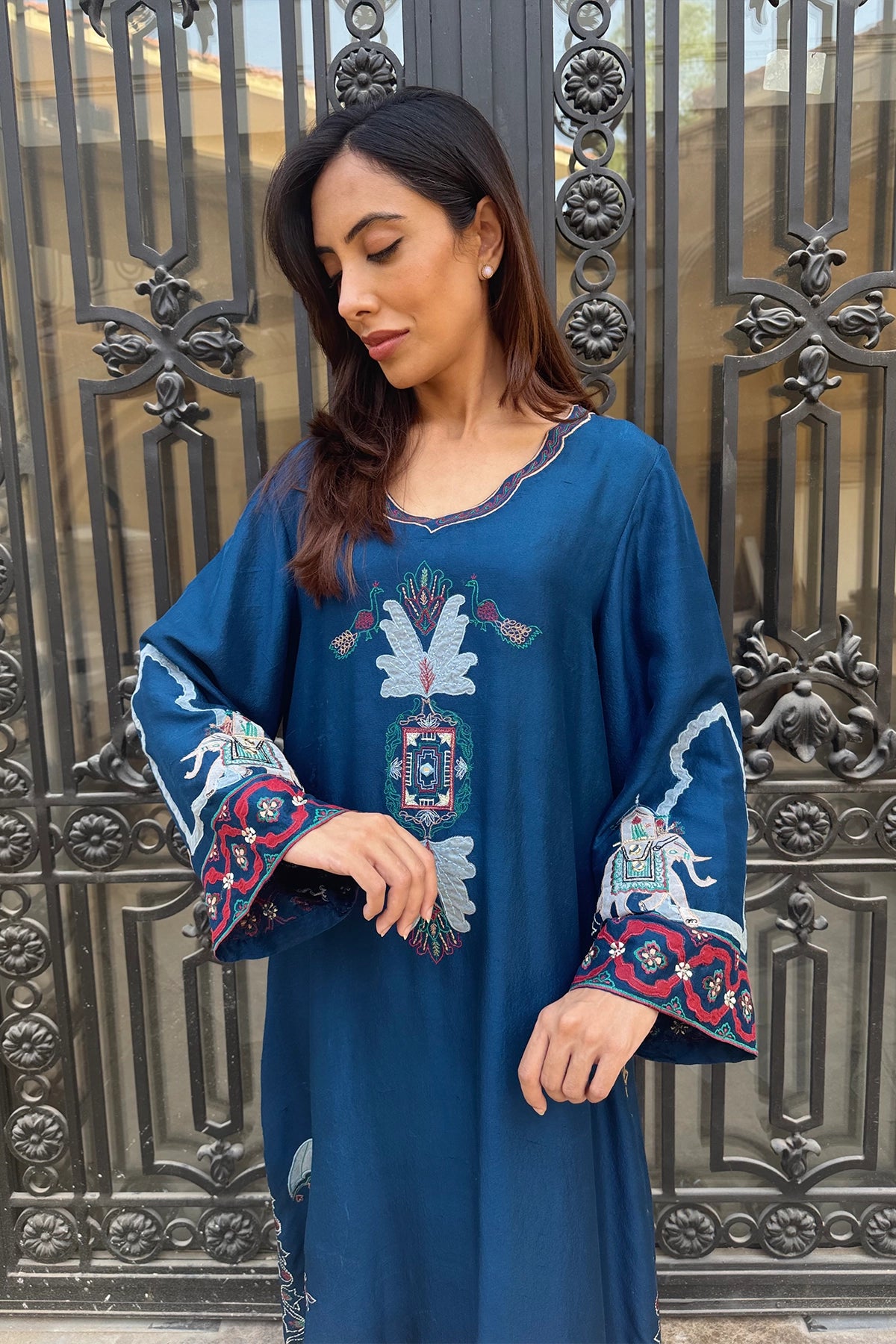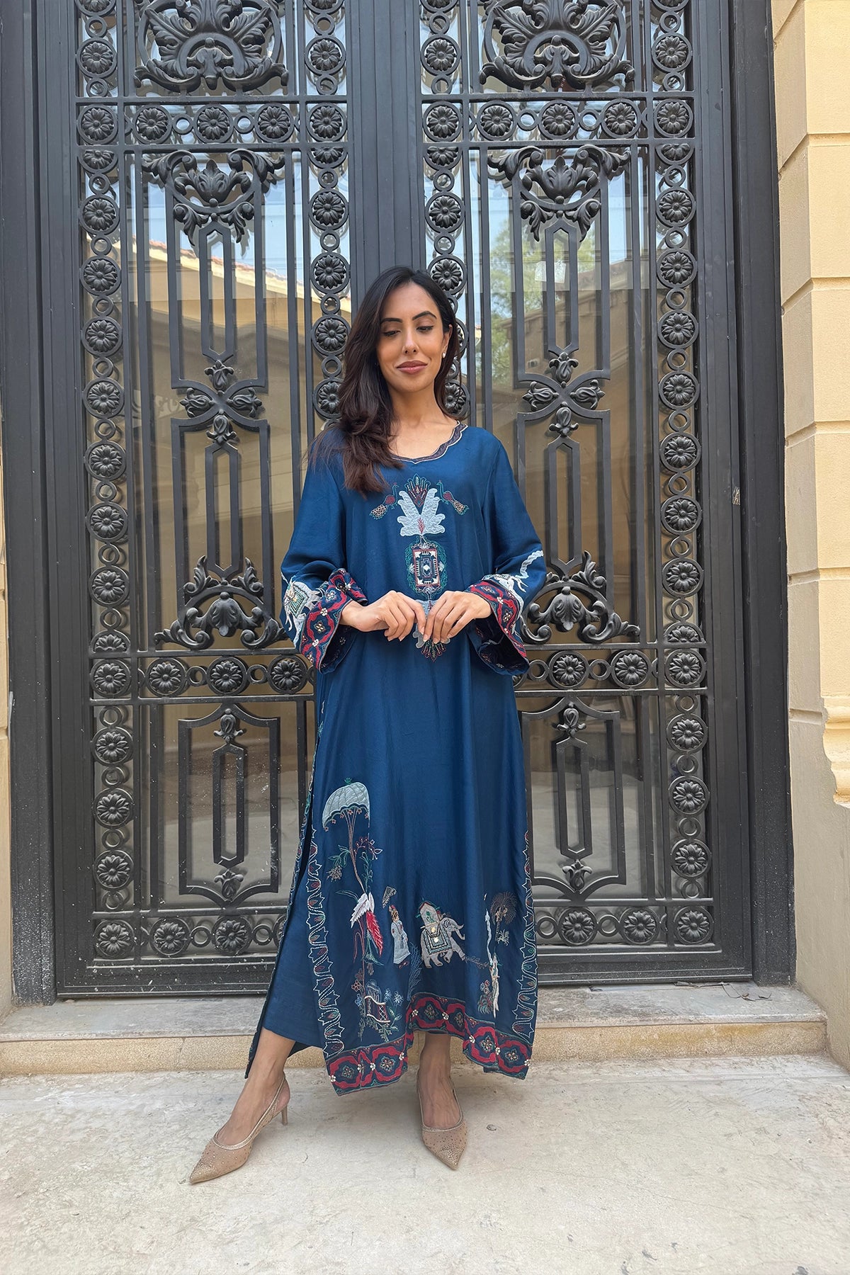 Navy Shikarga Majesty is a deep blue kaftan available in Pure Rawsilk and Sheesha Silk. Colorful embroidered motifs accent the neckline, hem, and cuffs, adding vibrancy to its flowing silhouette. Designed for comfort and refinement, this piece is a graceful choice for formal and festive occasions.