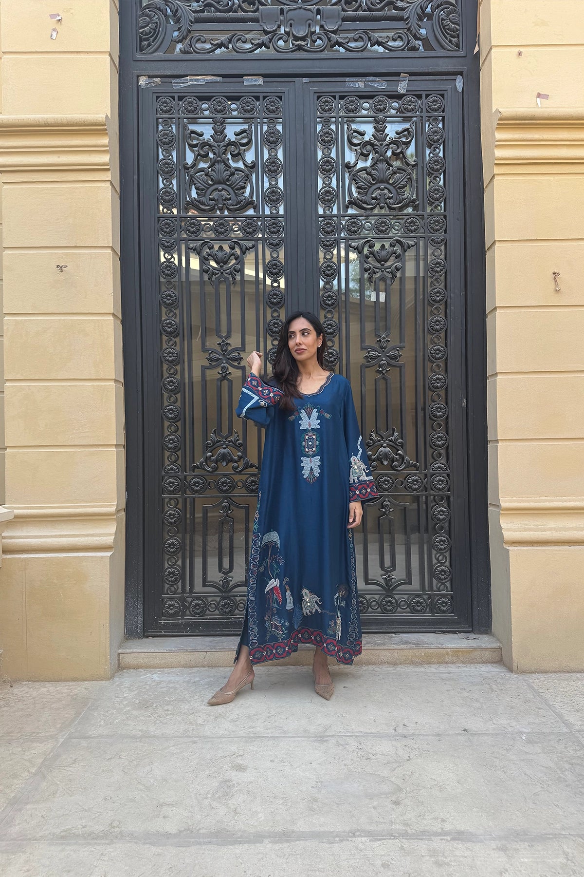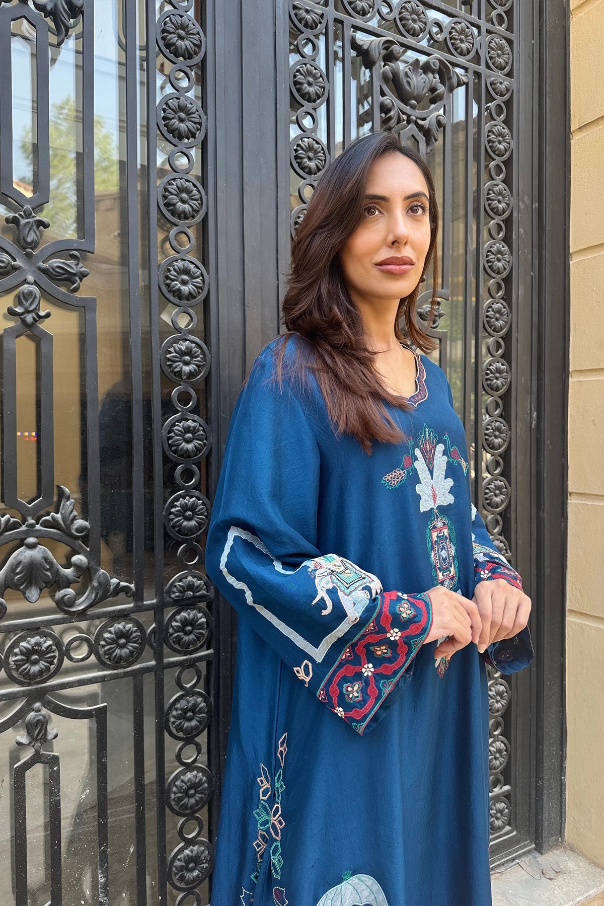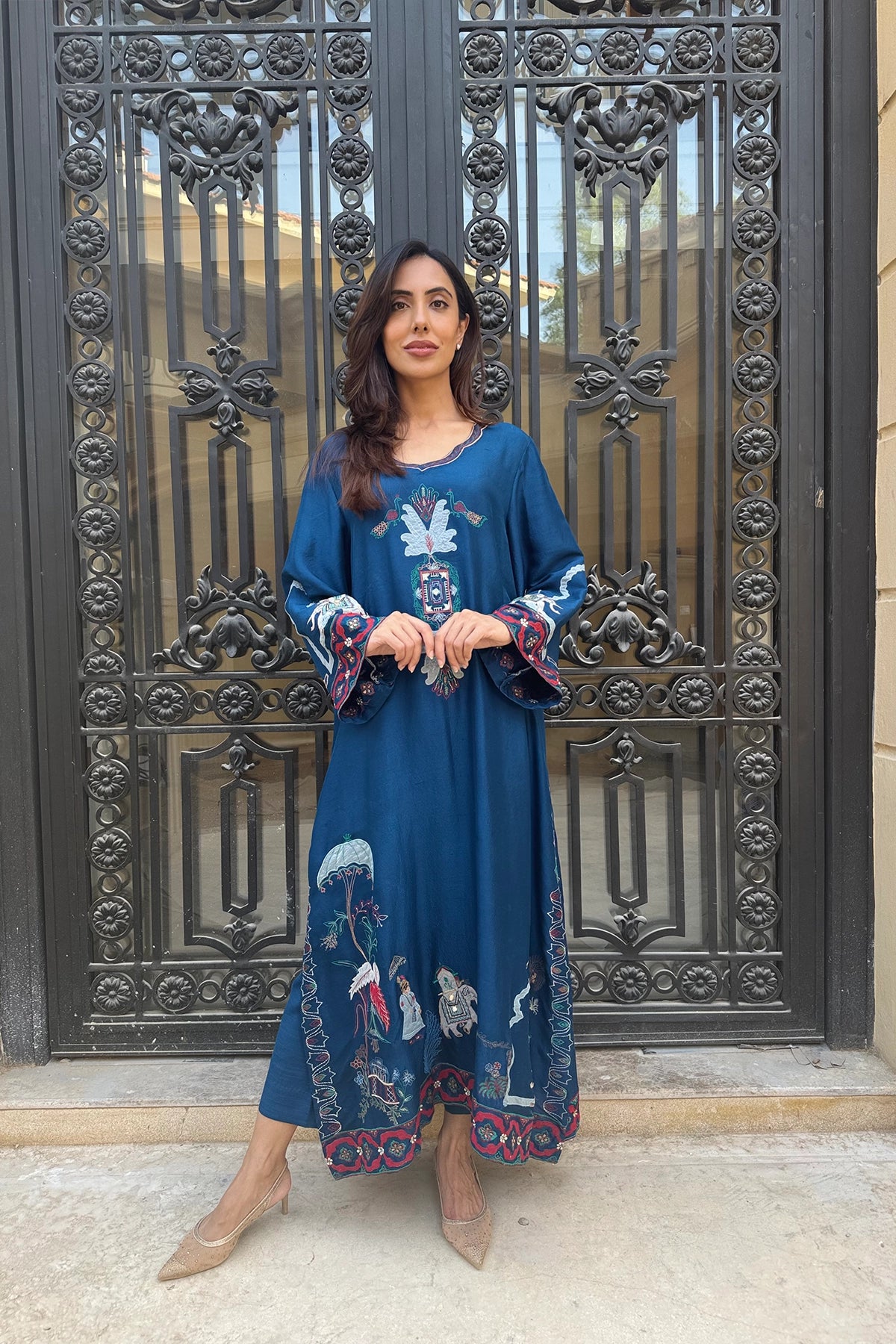 Navy Shikarga Majesty is a deep blue kaftan available in Pure Rawsilk and Sheesha Silk. Colorful embroidered motifs accent the neckline, hem, and cuffs, adding vibrancy to its flowing silhouette. Designed for comfort and refinement, this piece is a graceful choice for formal and festive occasions.
