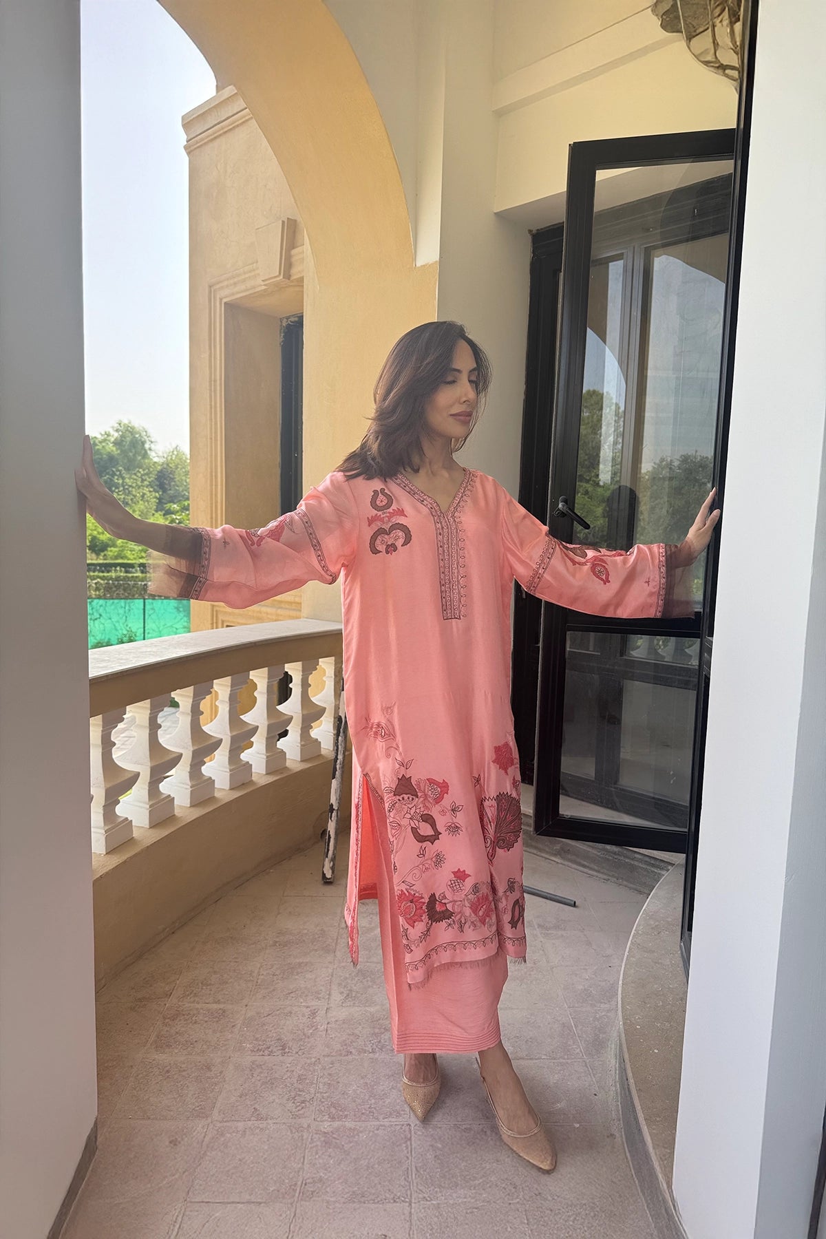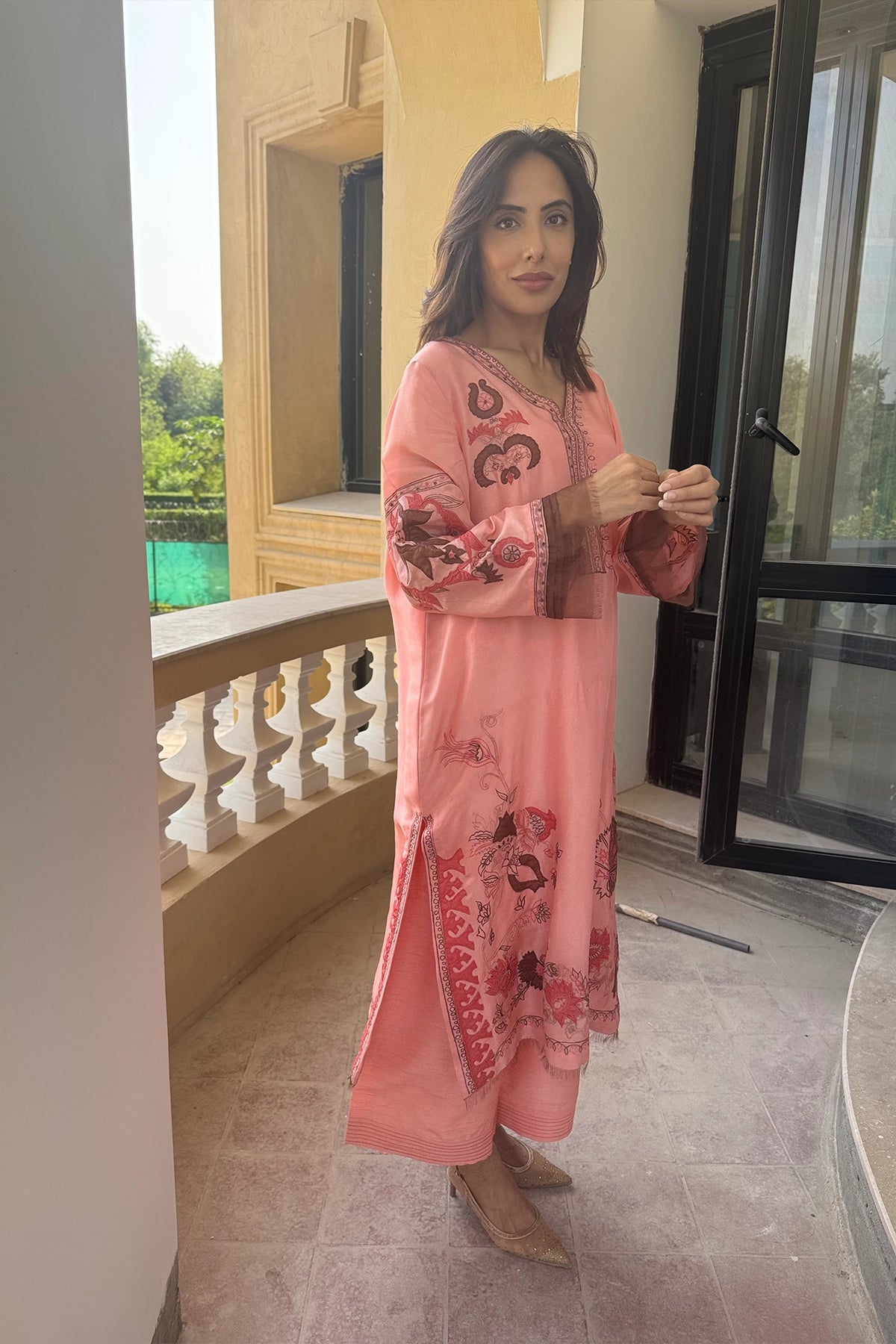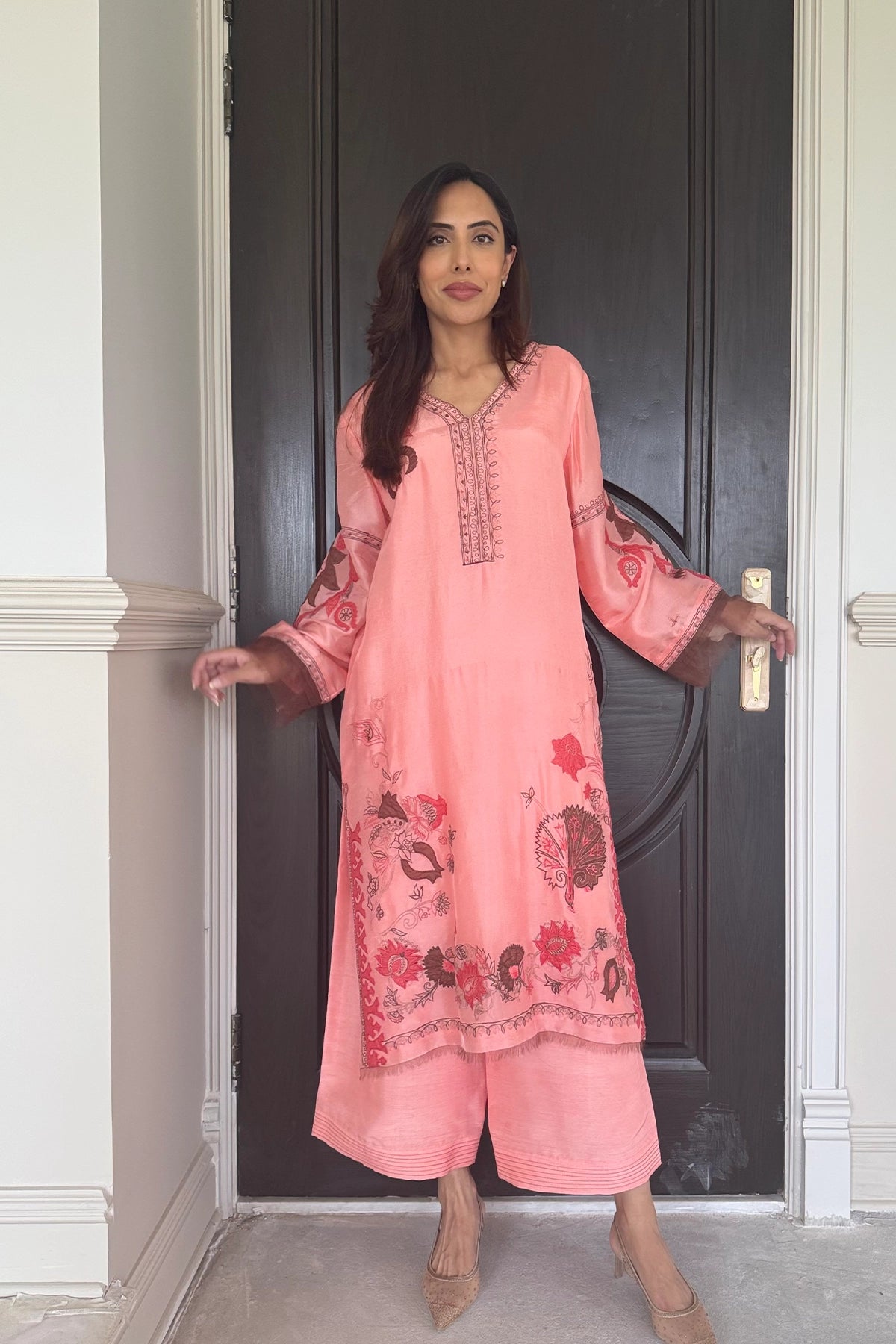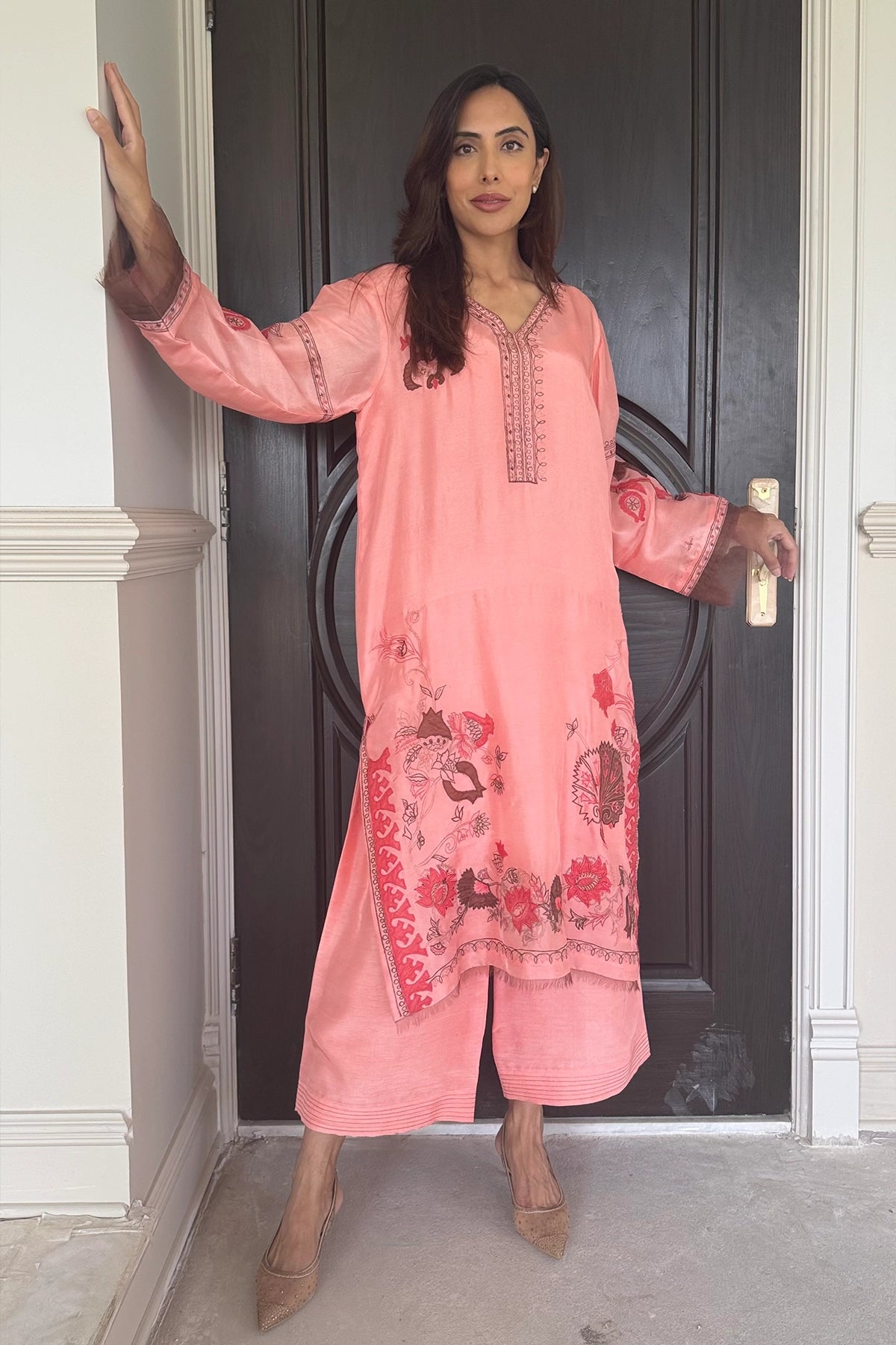Peach Bloom is a two-piece set available in Pure Rawsilk and Sheesha Silk. The straight, mid-length peach shirt is decorated with floral embroidery in shades of maroon, pink, and brown along the hem and sleeves. Paired with cropped, wide-leg trousers in a matching hue, this ensemble is a refined choice for festive and formal occasions.