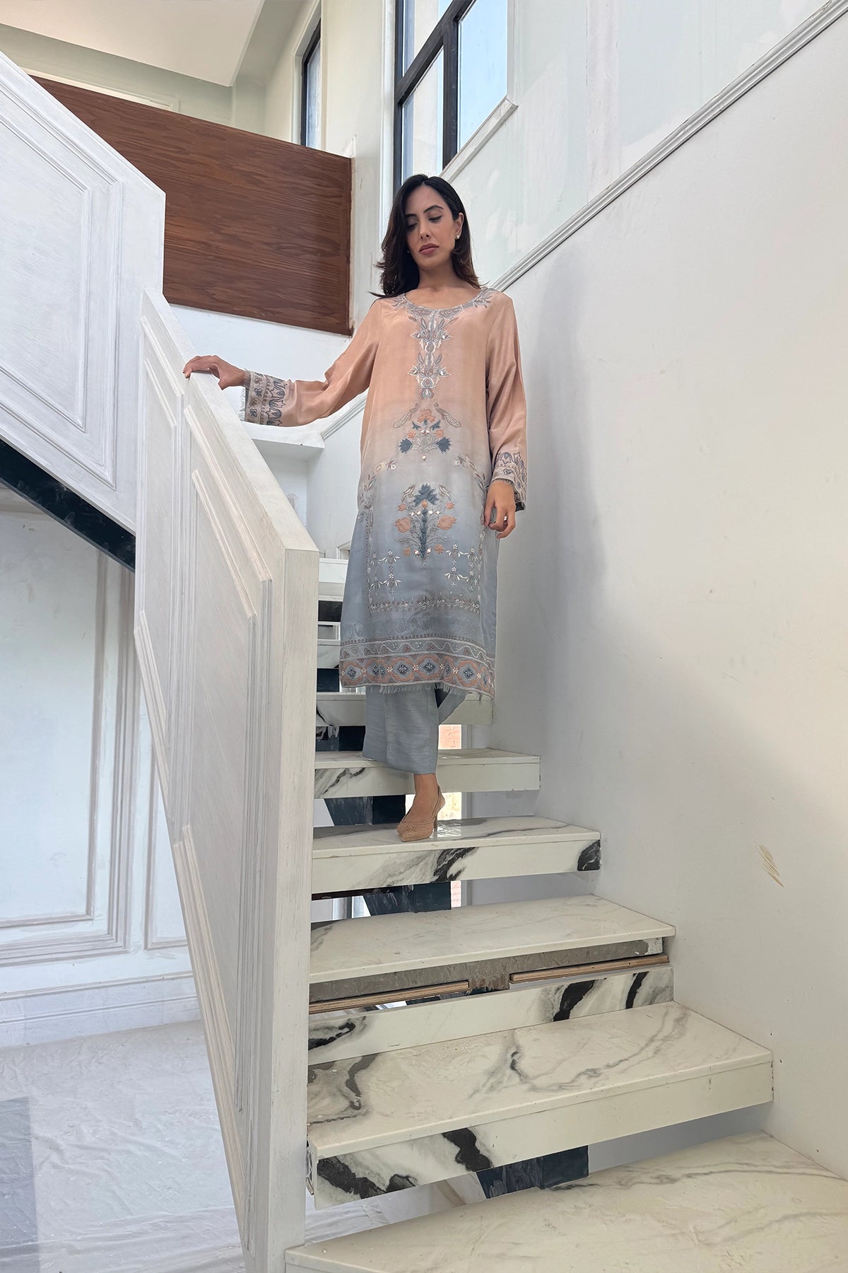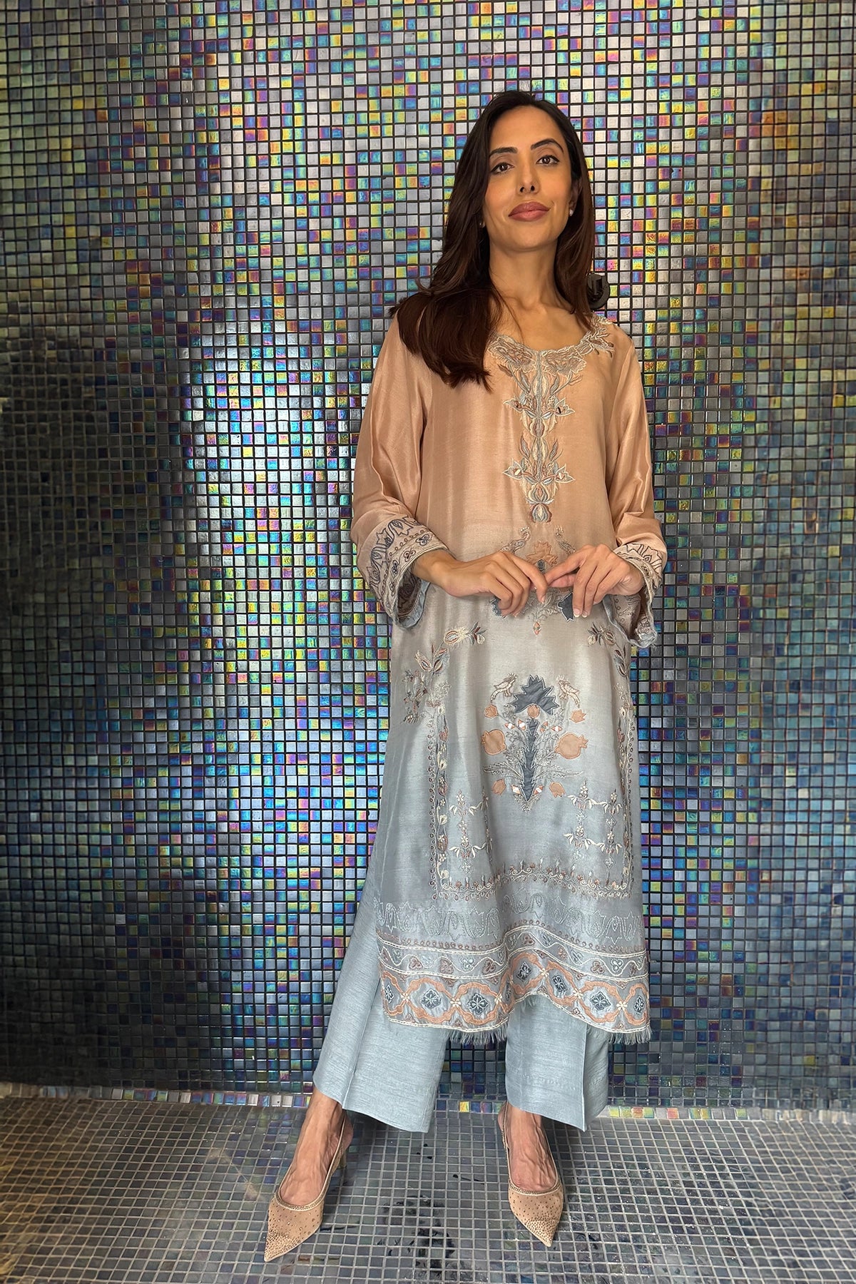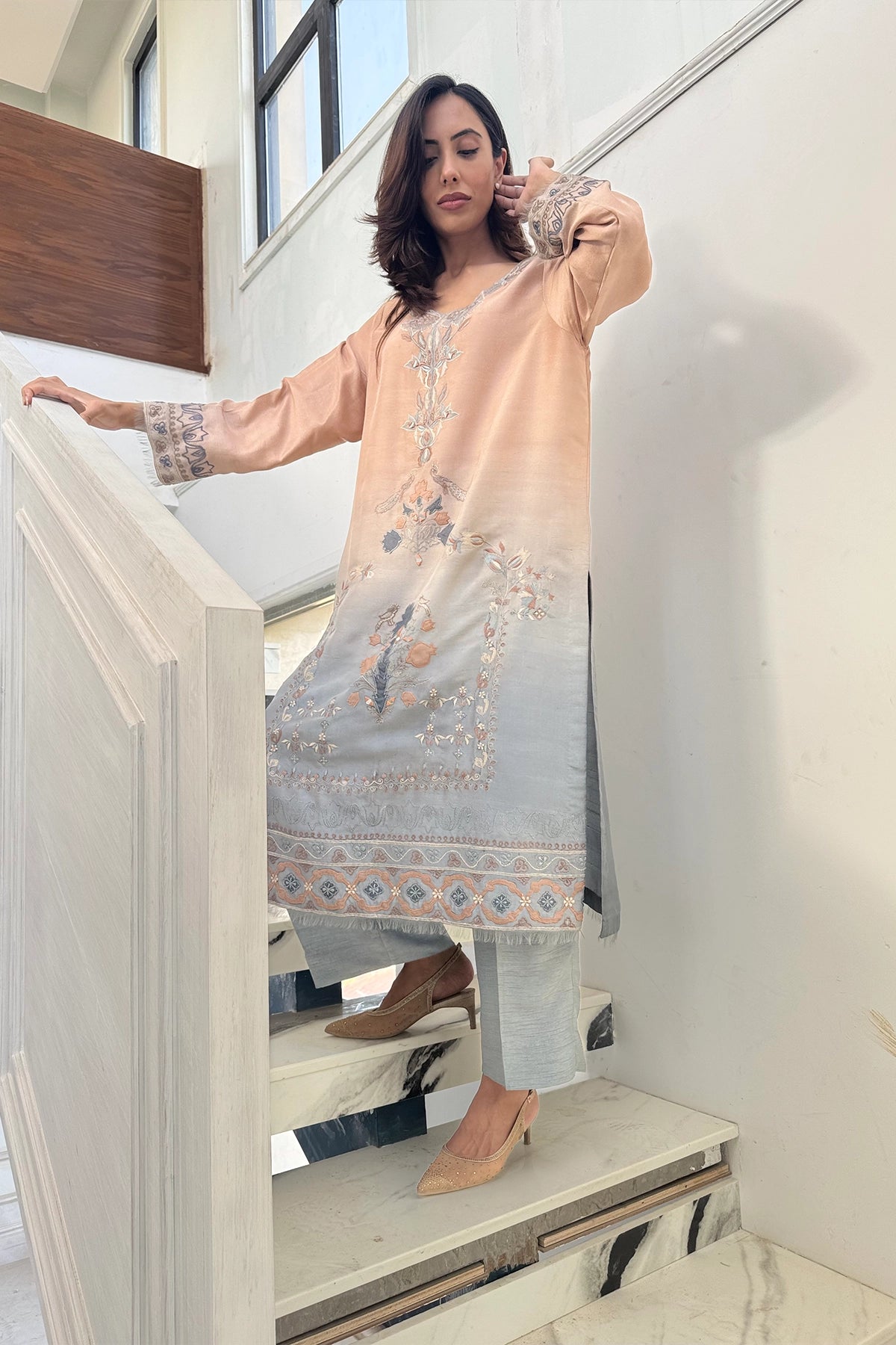 Peach Mist to Silver Glow is a refined two-piece ensemble available in Pure Rawsilk and Sheesha Silk. The long shirt features a contemporary two-toned design with a sheer peach-pink upper half and a soft gray lower half, detailed with delicate embellishments and embroidery, paired with light blue-gray straight trousers.