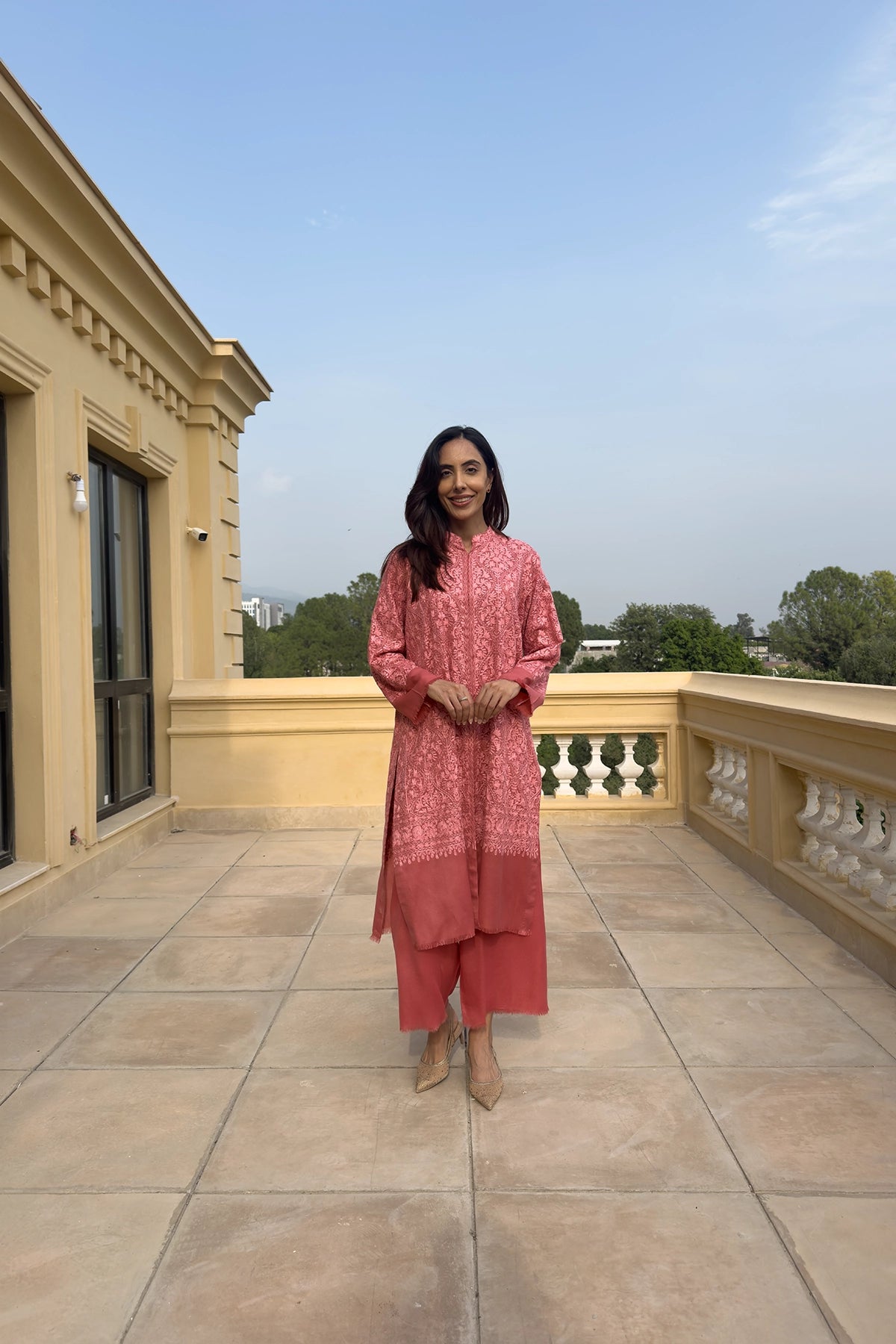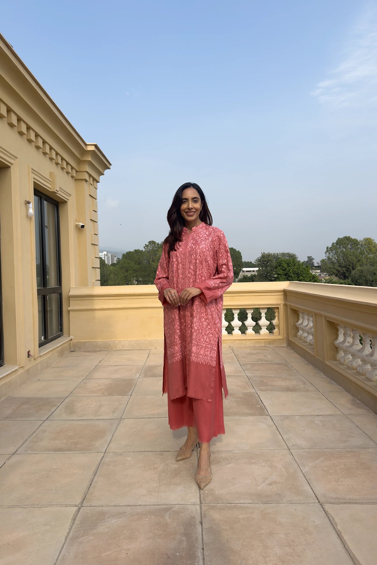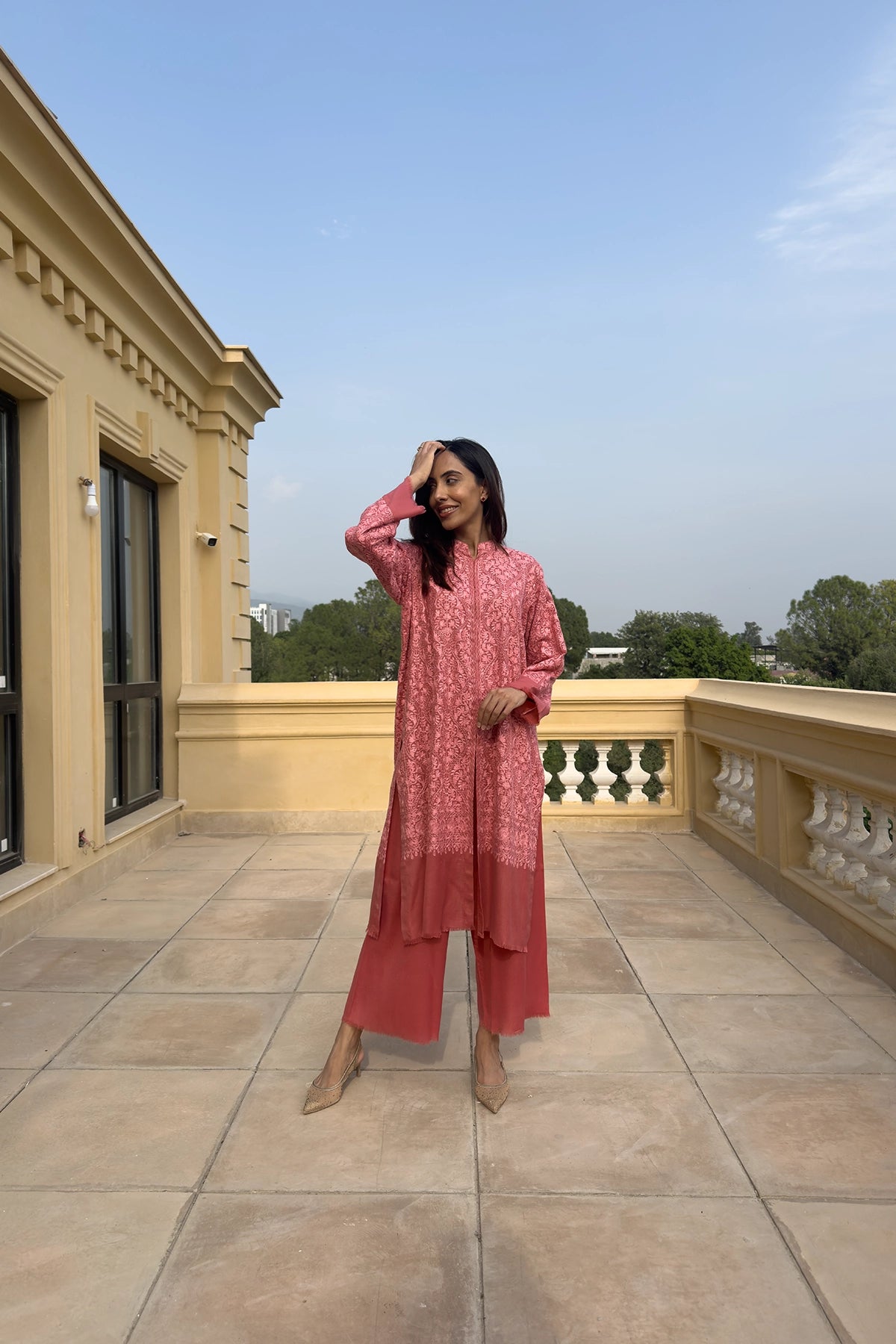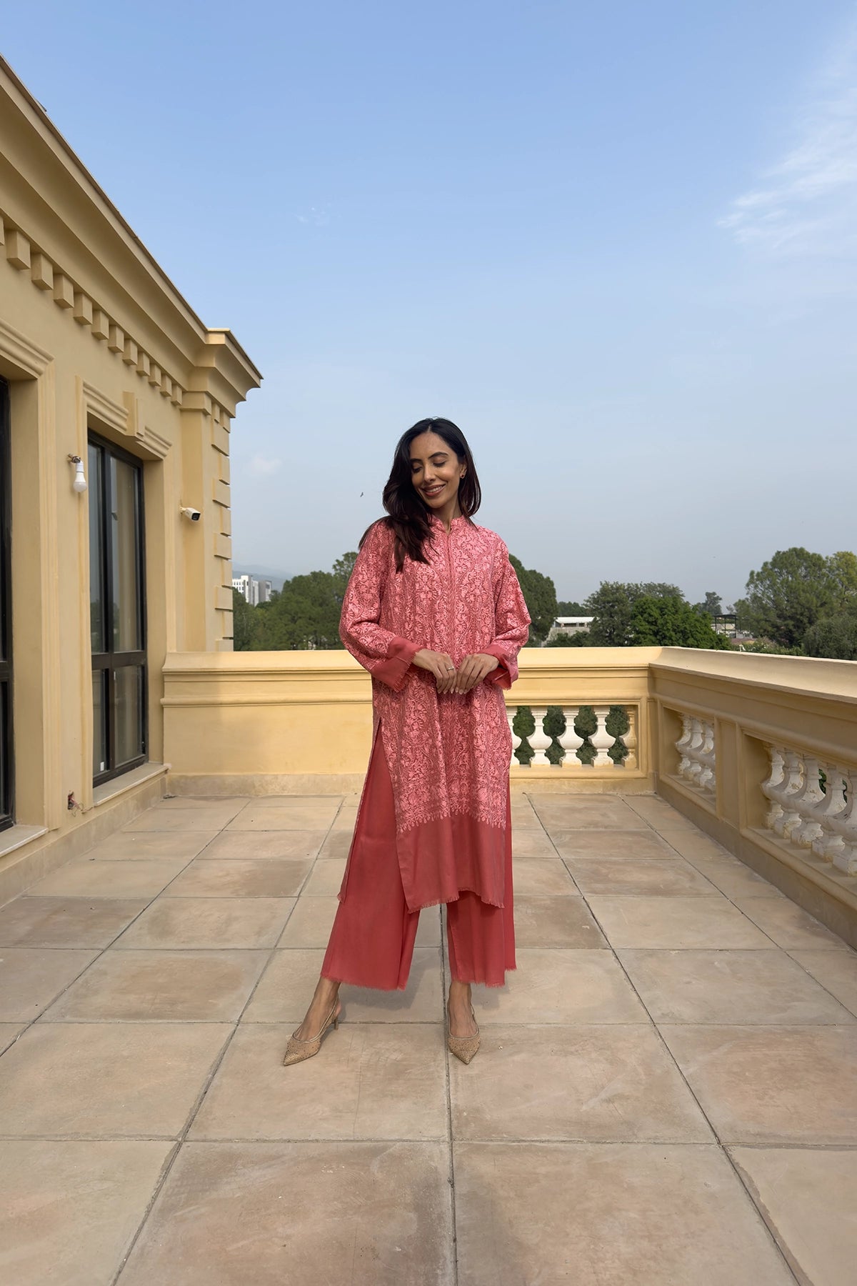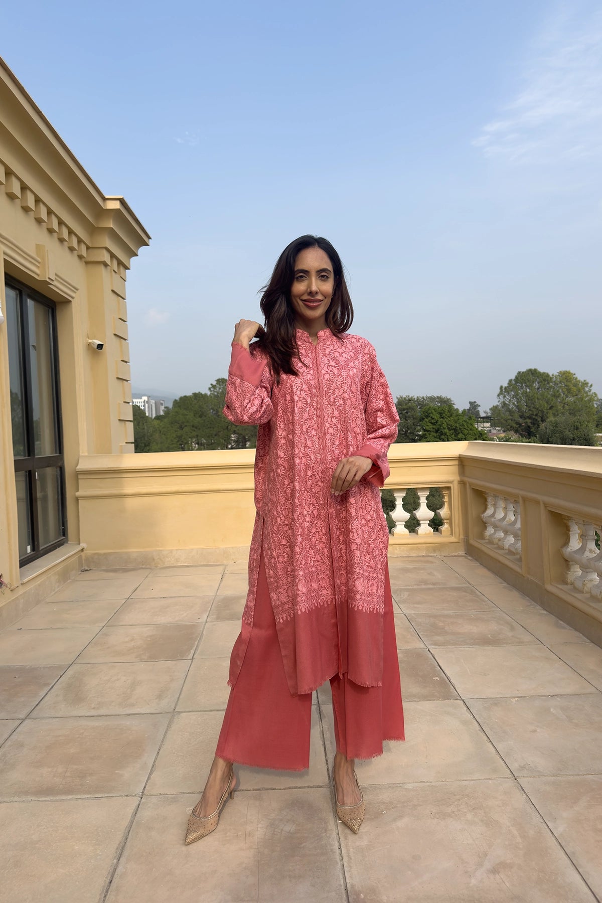 The Regal Rose is a luxurious Pashmina ensemble featuring a long, flowing tunic in a rich, all-over patterned print. This beautifully embroidered outfit is paired with contrasting maroon trousers, offering a traditional yet elegant winter aesthetic.