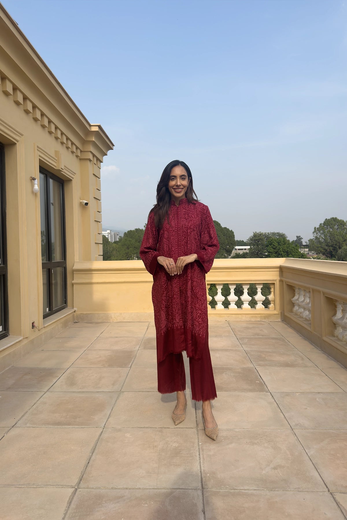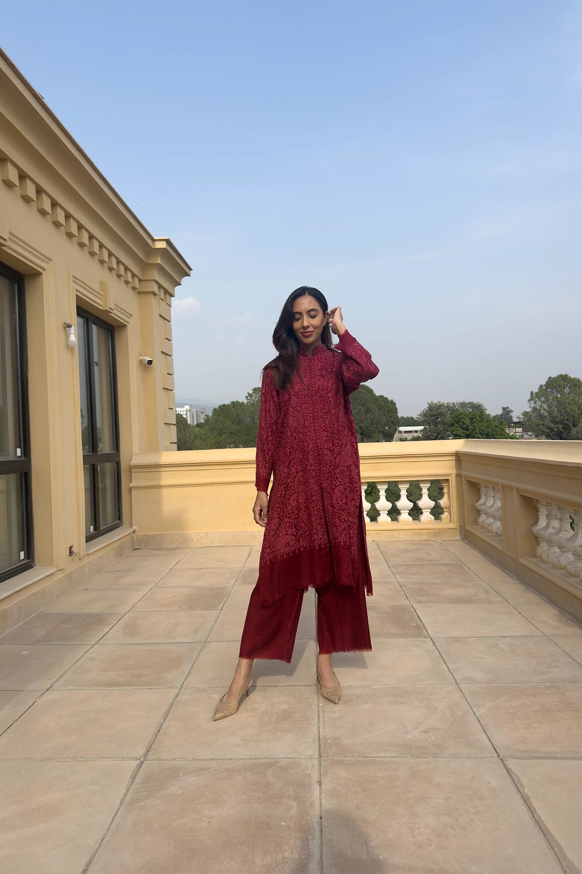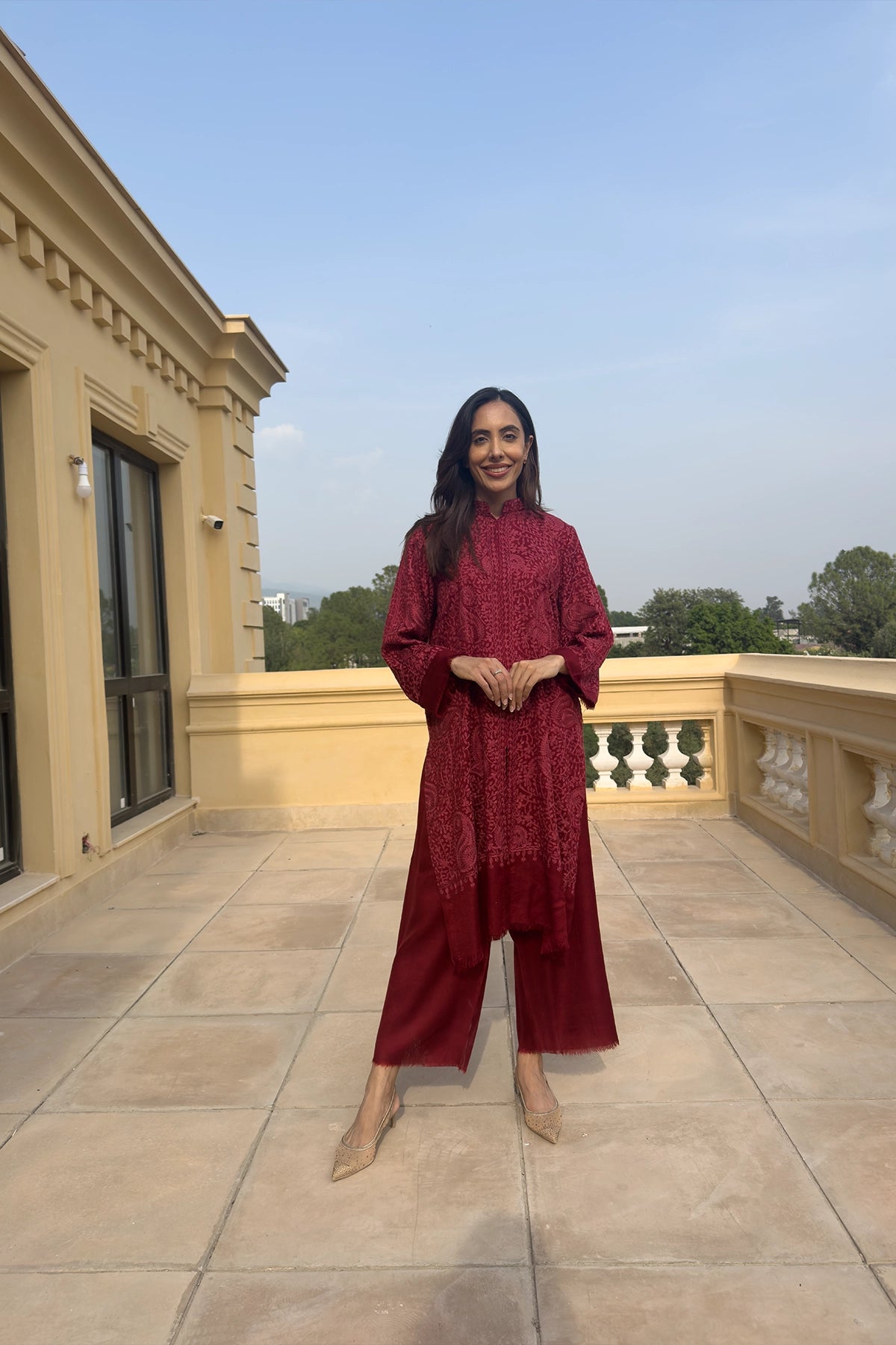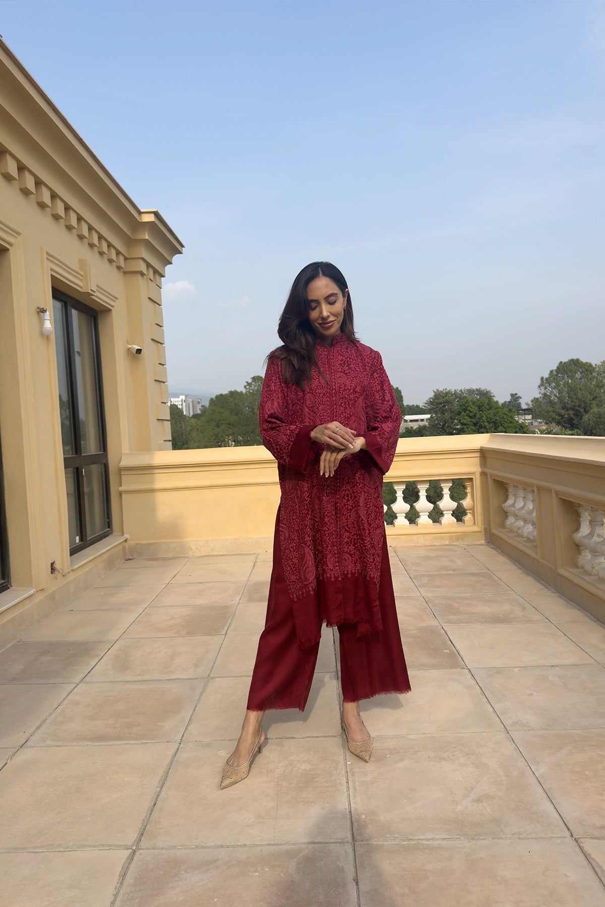 The Royal Ruby is a rich, embroidered ensemble made from luxurious Pashmina fabric, featuring an all-over patterned kurta in a deep ruby-red shade. The long tunic is elegantly paired with matching wide-leg trousers, creating a cohesive and traditional winter look.