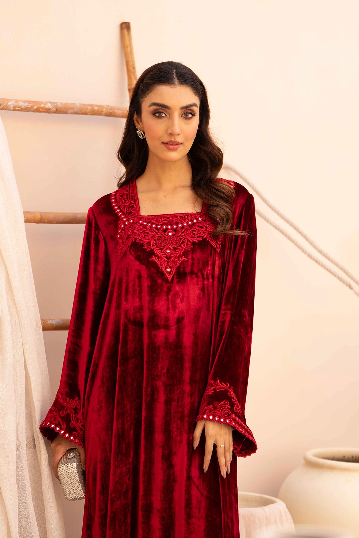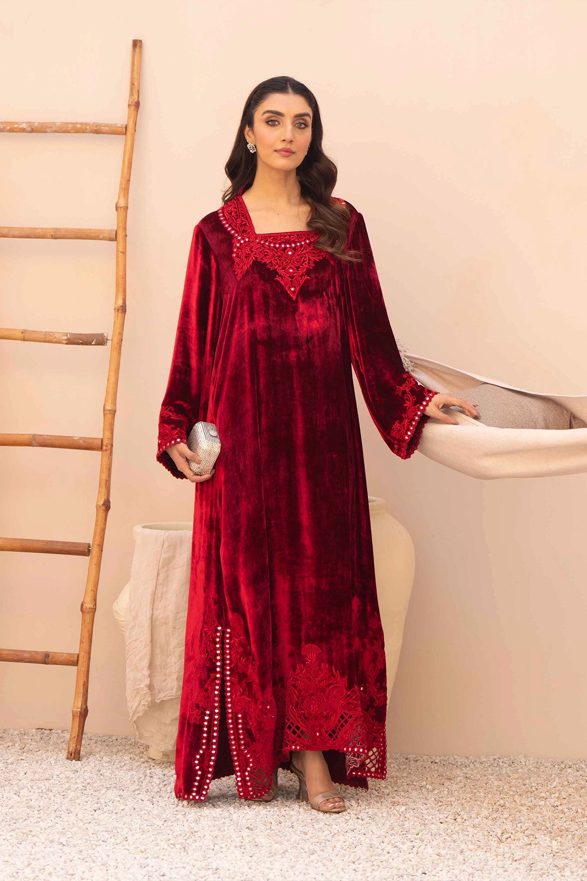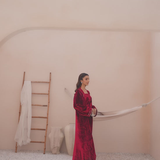 A ruby red velvet kaftan featuring a square neckline with matching cutwork lace. The hemline has a scalloped cutwork lace border with subtle embroidery and embellishments that also appear on the sleeve cuffs. Available in both french and micro velvet.