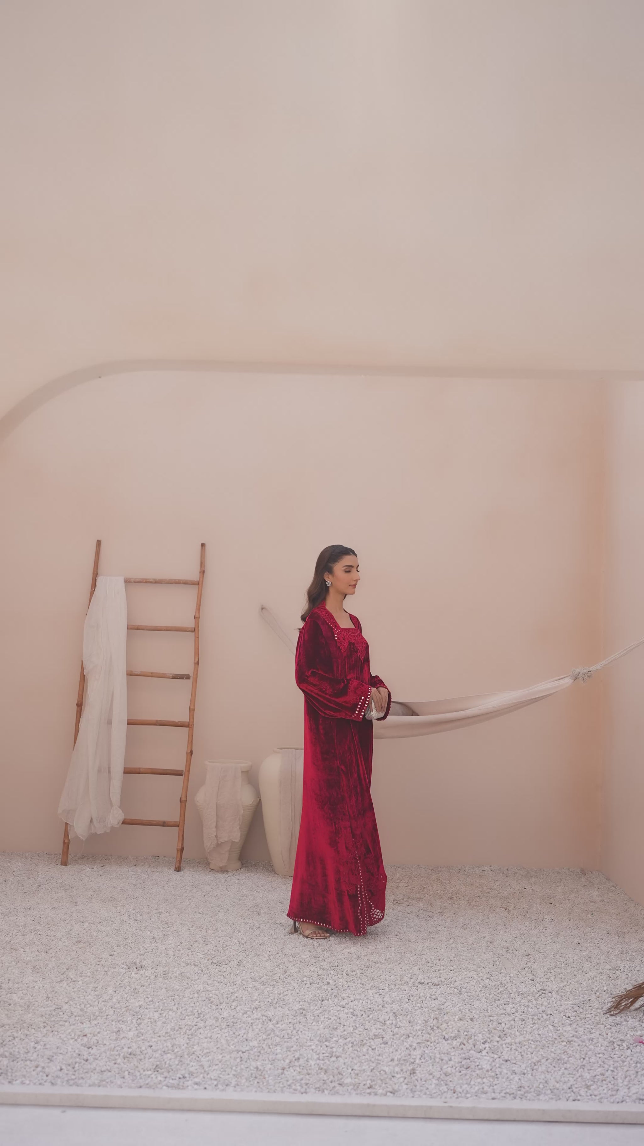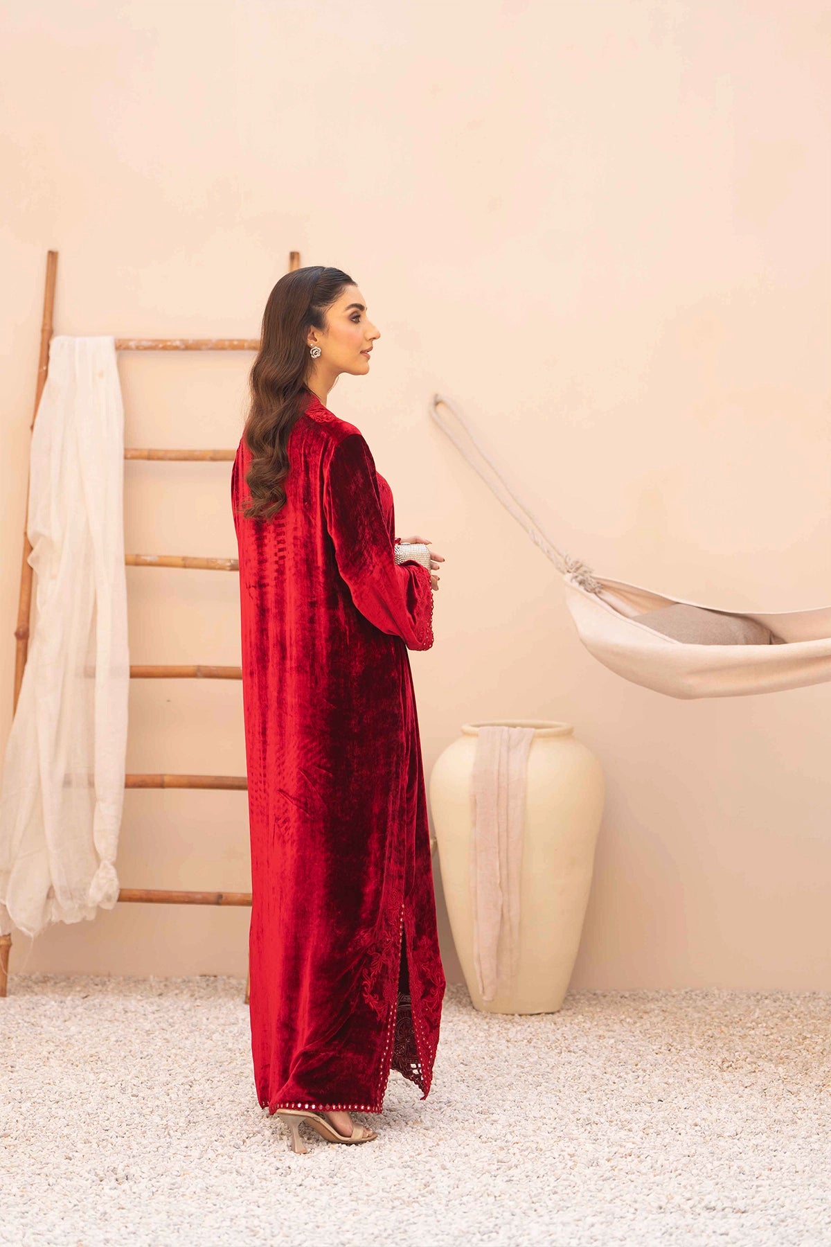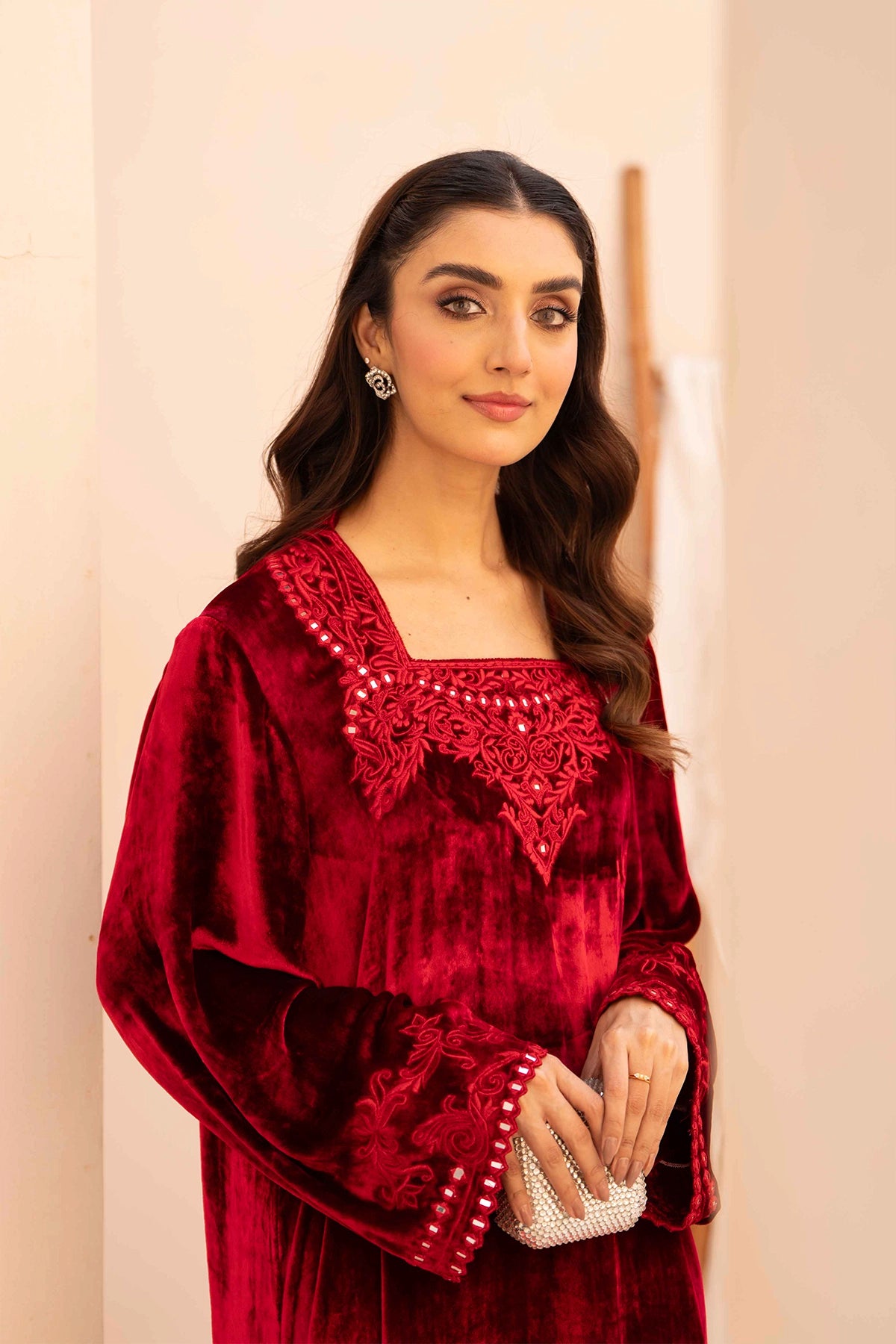 A ruby red velvet kaftan featuring a square neckline with matching cutwork lace. The hemline has a scalloped cutwork lace border with subtle embroidery and embellishments that also appear on the sleeve cuffs. Available in both french and micro velvet.