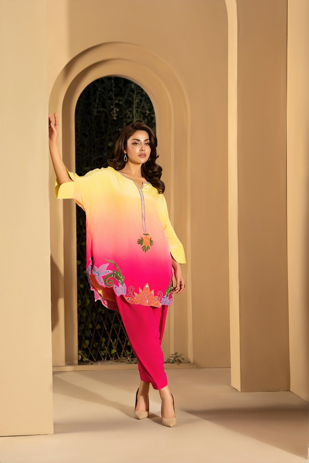 This 2-piece set captures the season’s true color palette, pairing a vibrant pink with a serene yellow, detailed with beautiful floral embroidery across the neckline and hem. Available in both Pure 80 gr Grip and Shisha Silk, it perfectly balances comfort and elegance. Pure 80 gr Grip is lightweight, breathable, and maintains its shape, while Shisha Silk offers a smooth, subtly glossy finish, perfect for adding a refined touch to formal occasions. It comes stitched and is available in a full range of sizes from XS to XXL, offering a complete ready-to-wear solution for everyone.